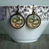 Lightweight earrings have an antiqued bronze finish for a warm, heirloom appearance with lovingly handmade reversed decoupage glass cabochons in elegant base metal findings.