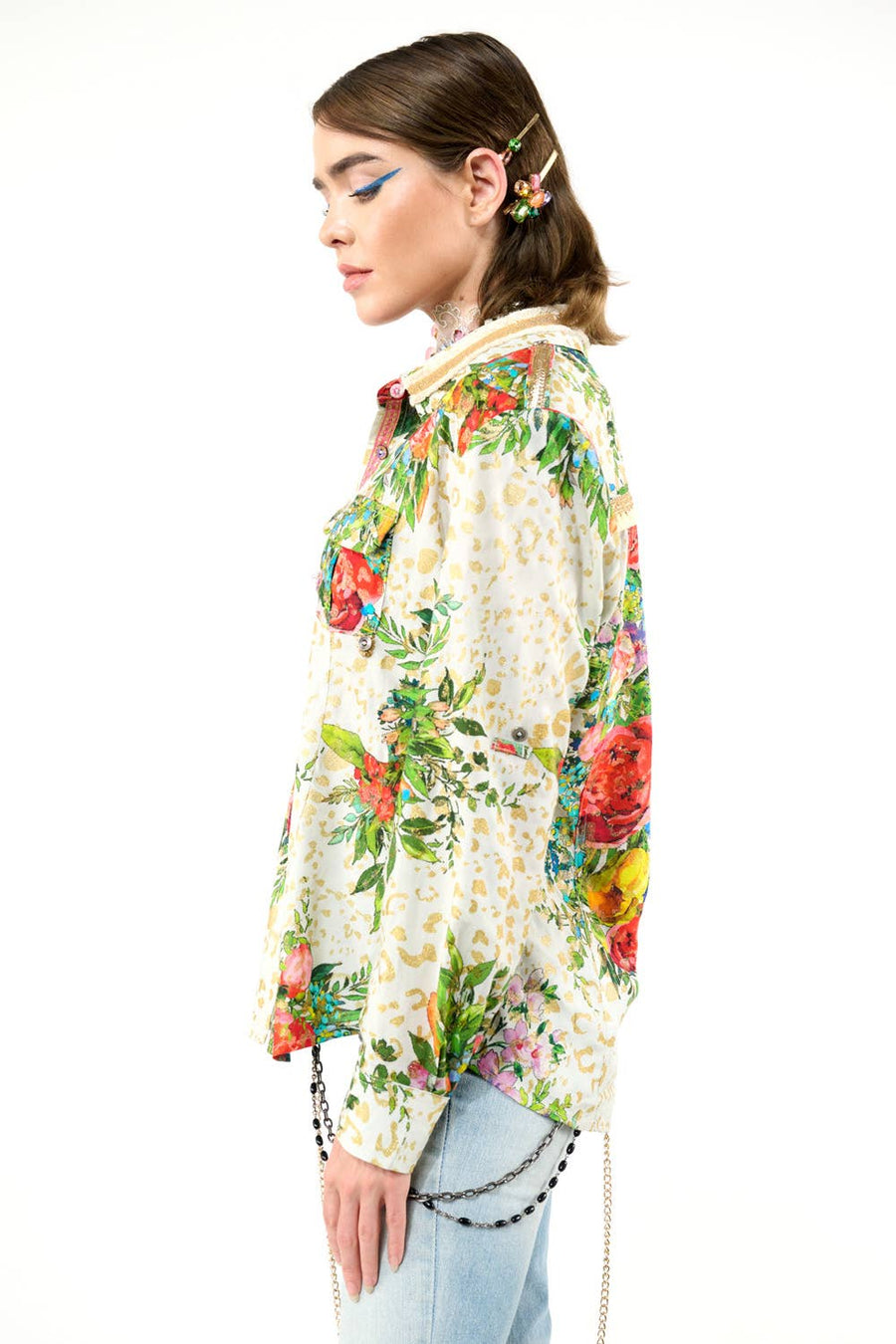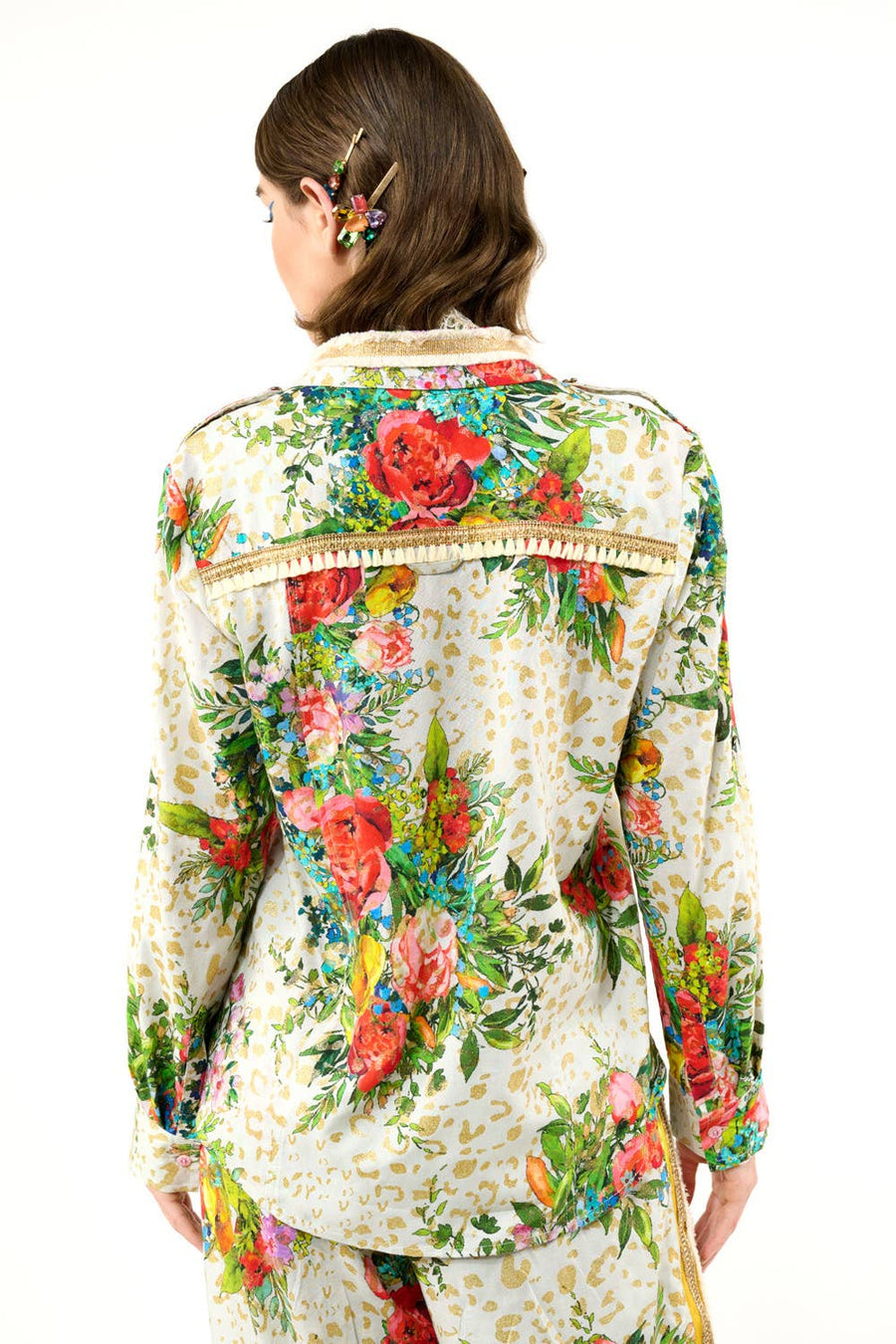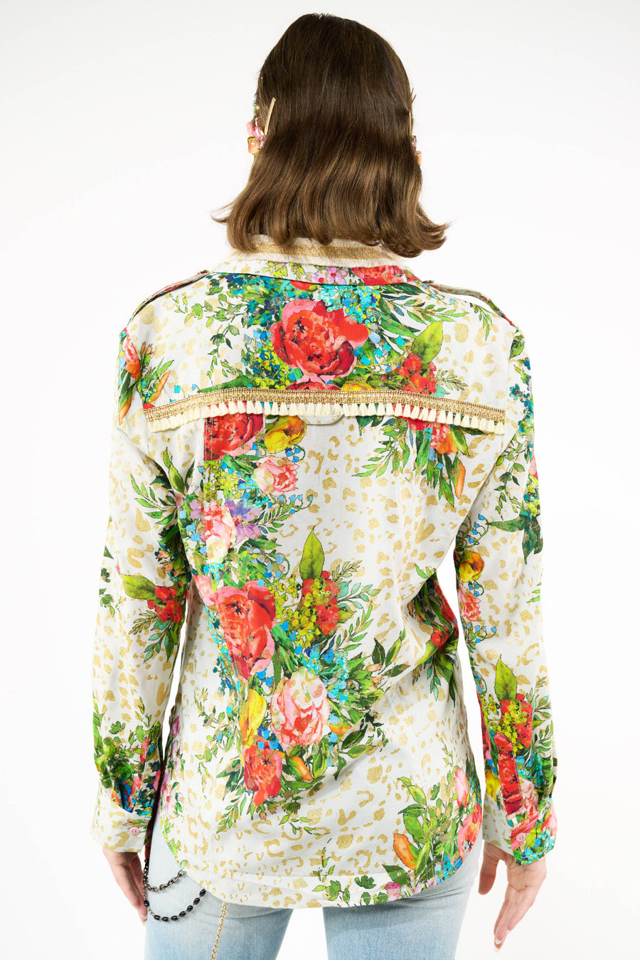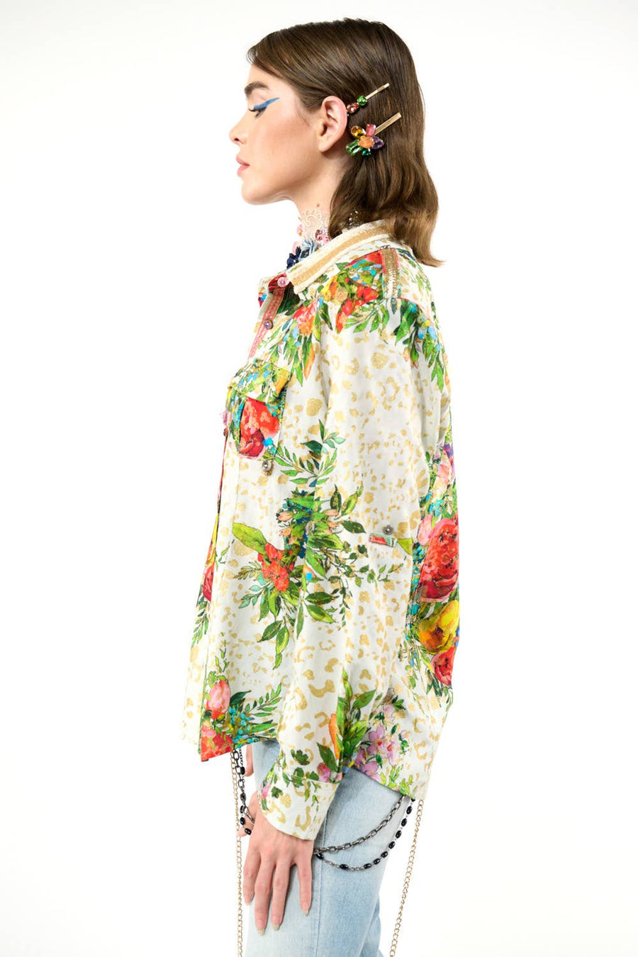 Floral print leopard glitter button-down shirt with special trimmings on CF placket, collar, shoulder tabs, and back yoke seam, 2 front flap pockets