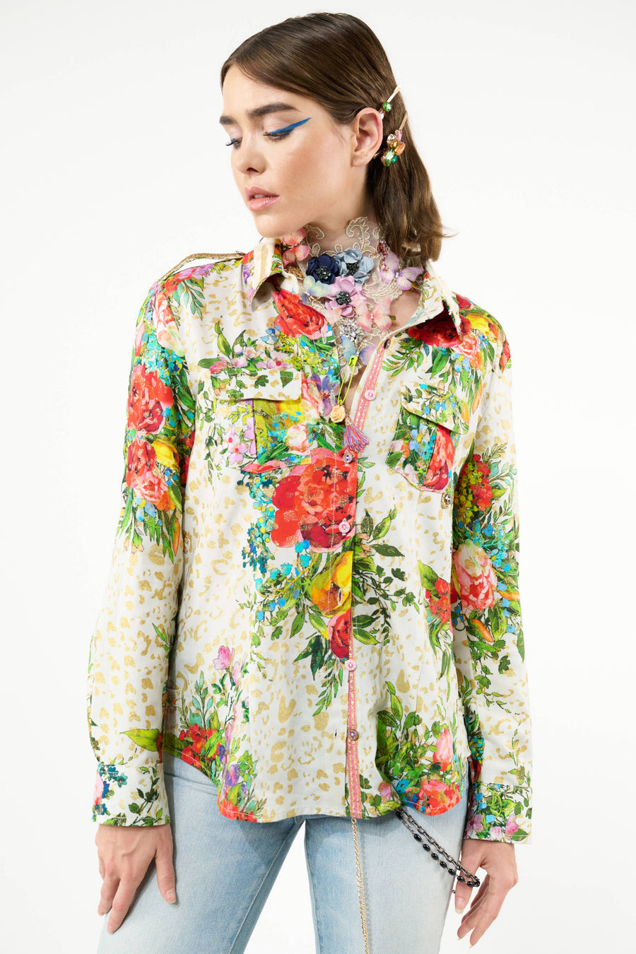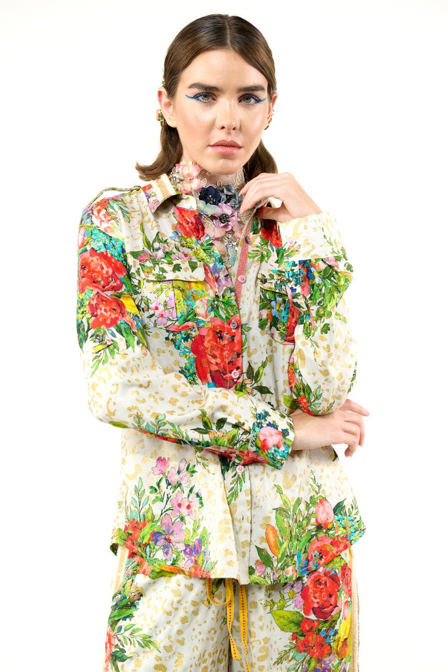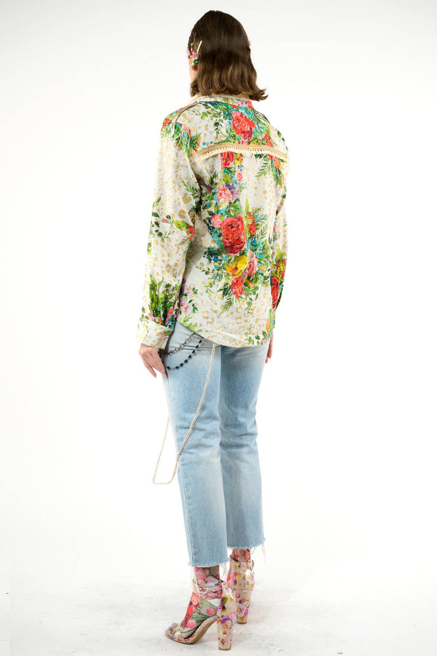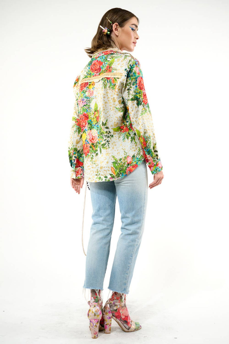 Floral print leopard glitter button-down shirt with special trimmings on CF placket, collar, shoulder tabs, and back yoke seam, 2 front flap pockets