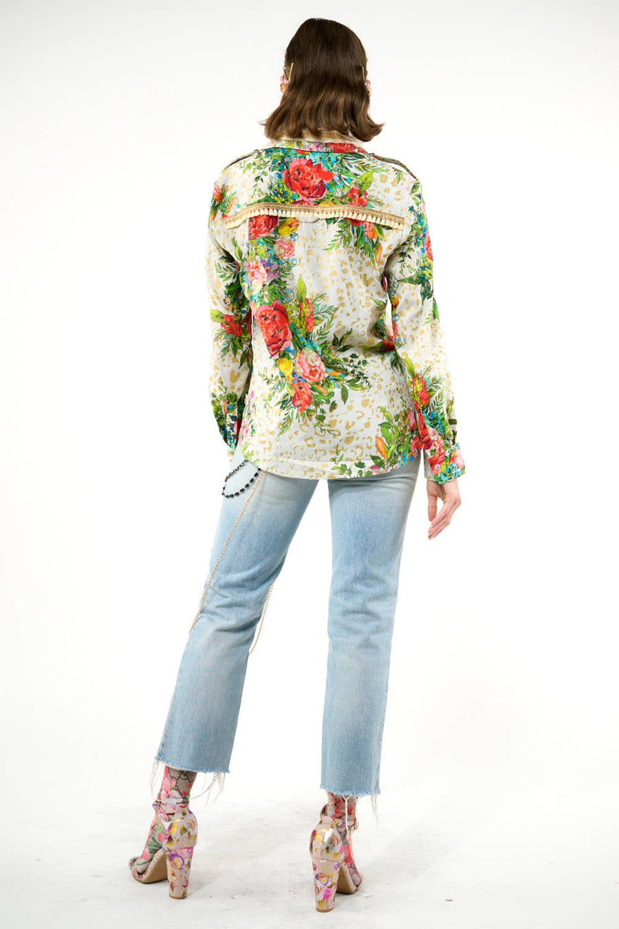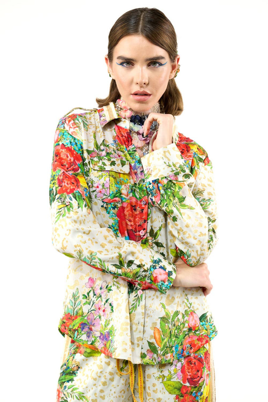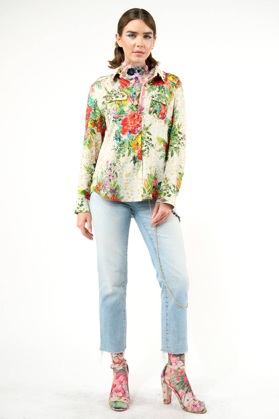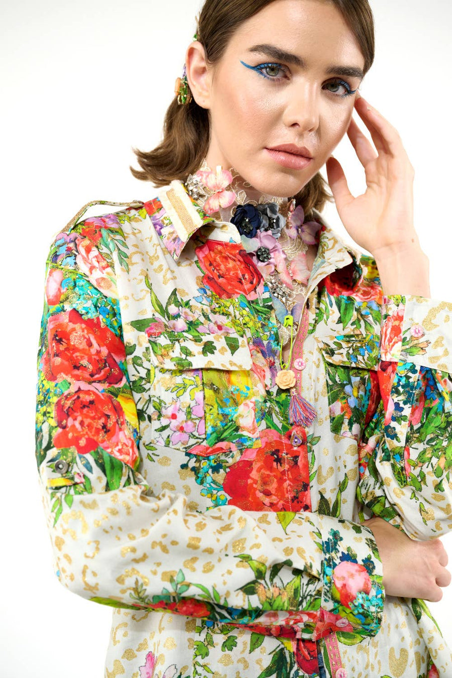 Floral print leopard glitter button-down shirt with special trimmings on CF placket, collar, shoulder tabs, and back yoke seam, 2 front flap pockets