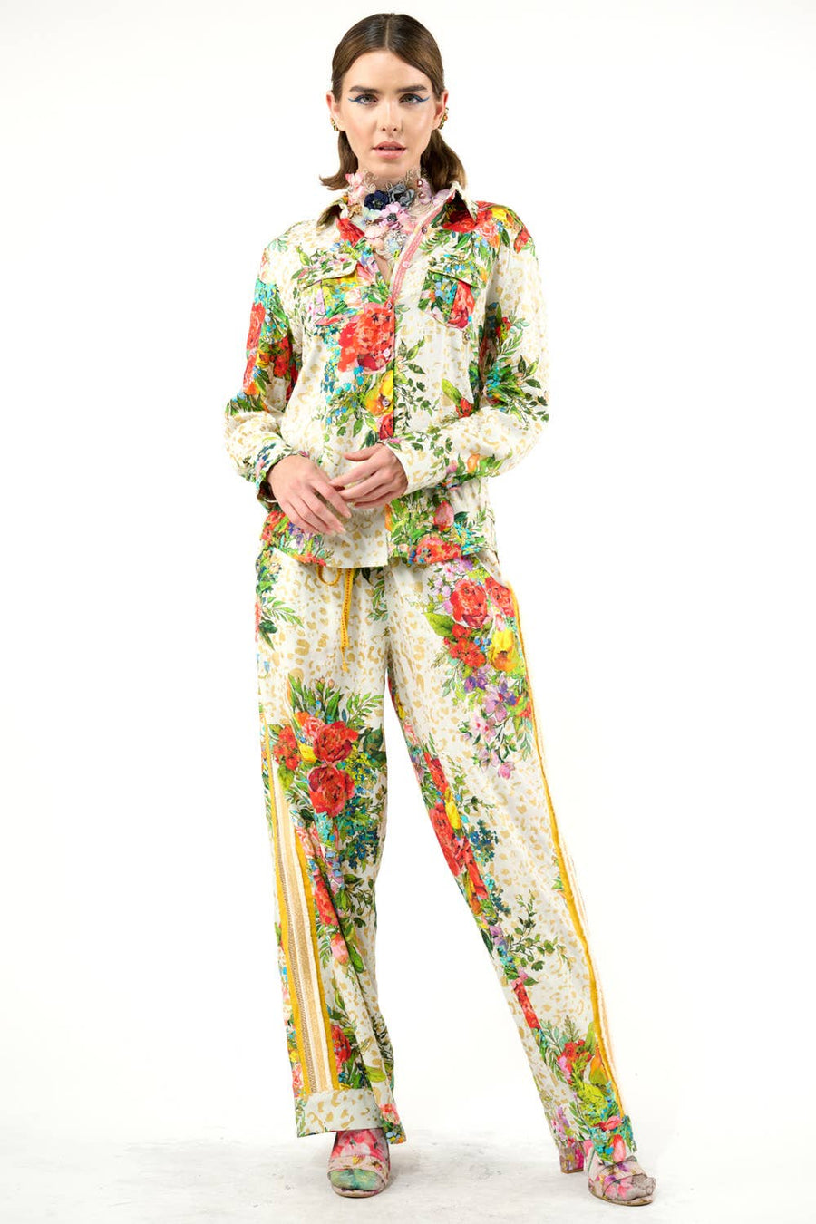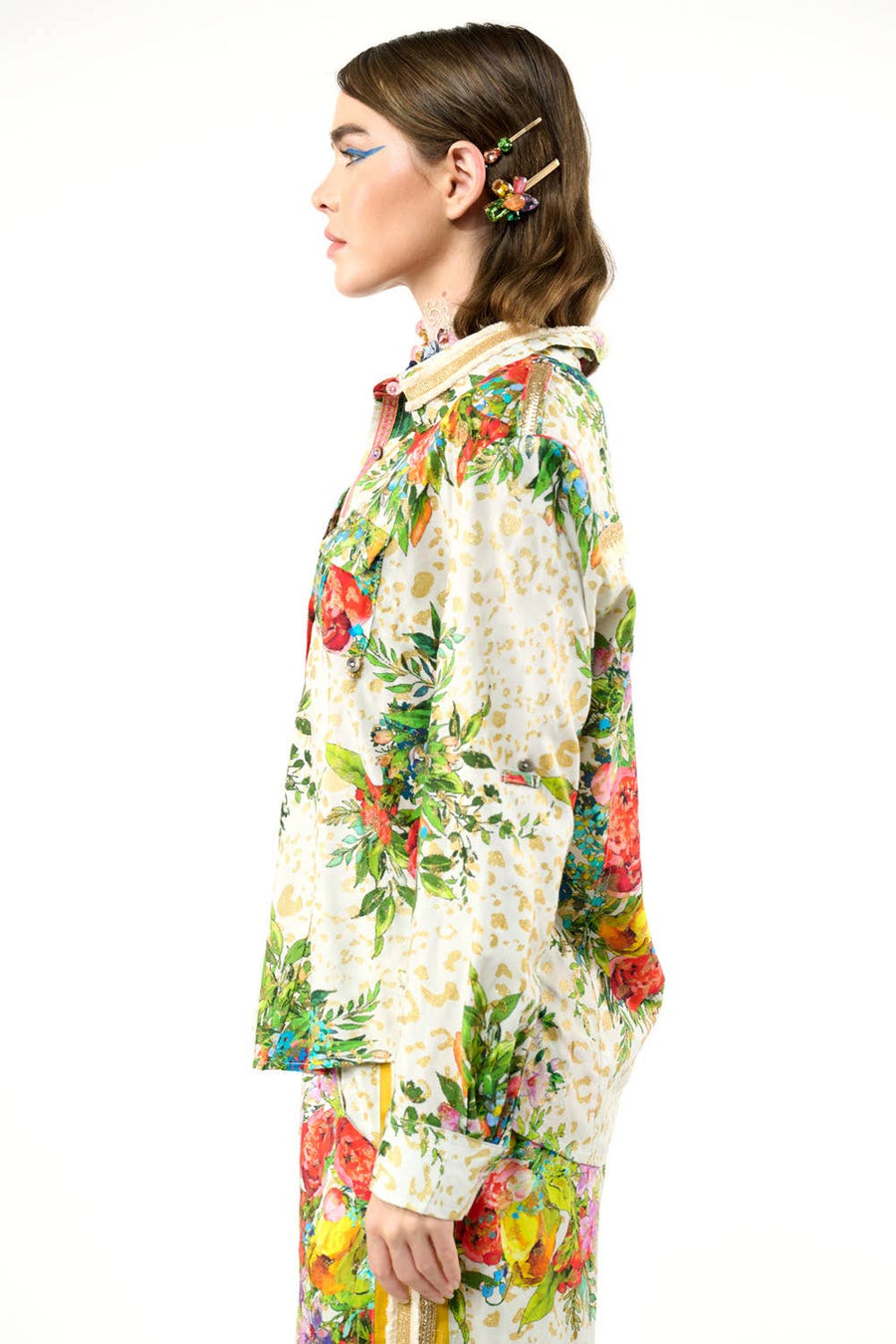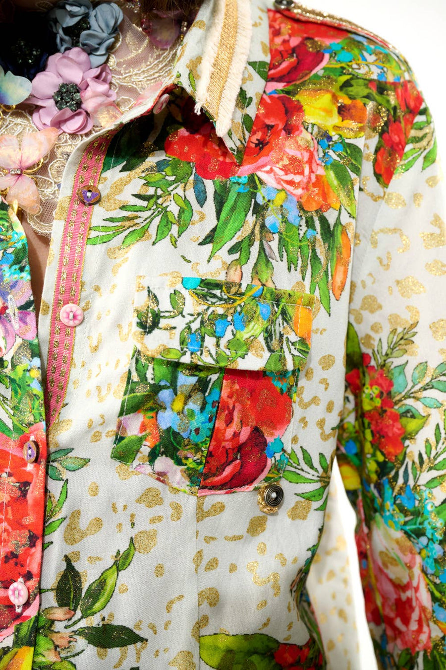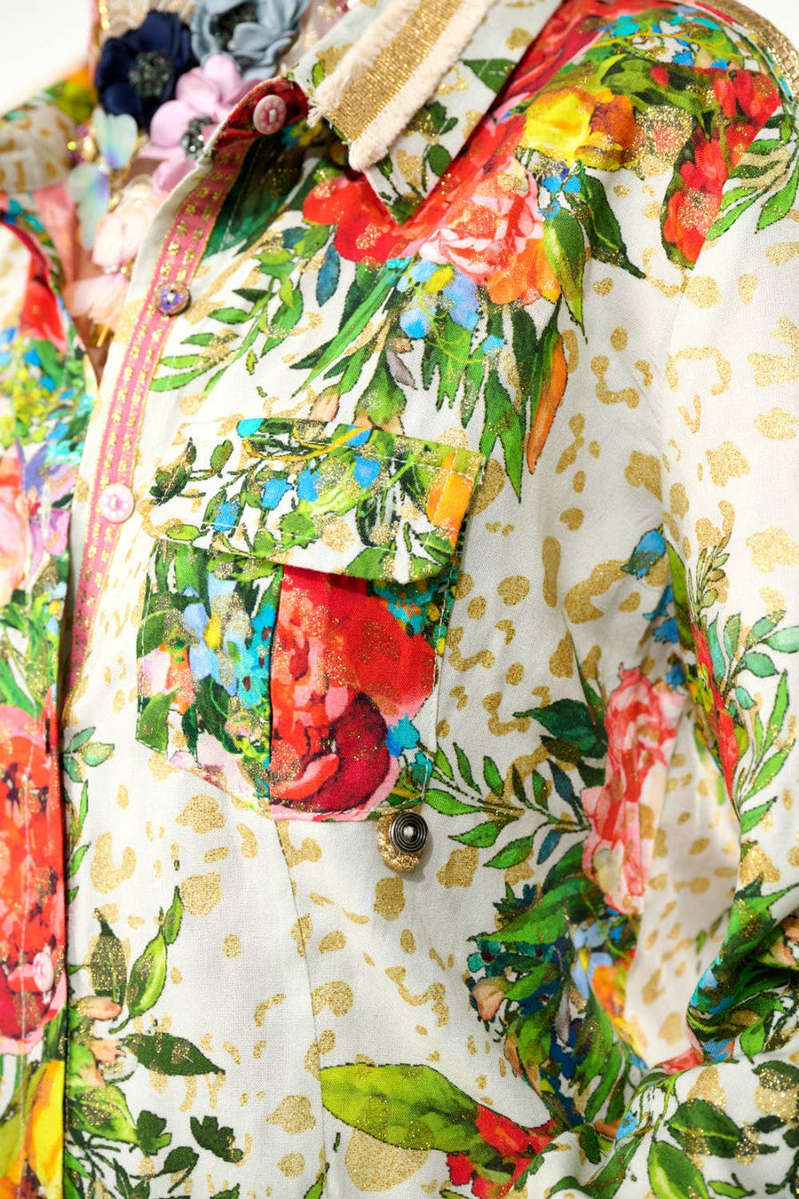 Floral print leopard glitter button-down shirt with special trimmings on CF placket, collar, shoulder tabs, and back yoke seam, 2 front flap pockets