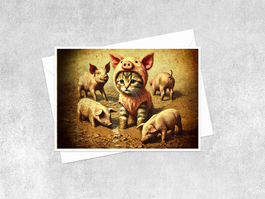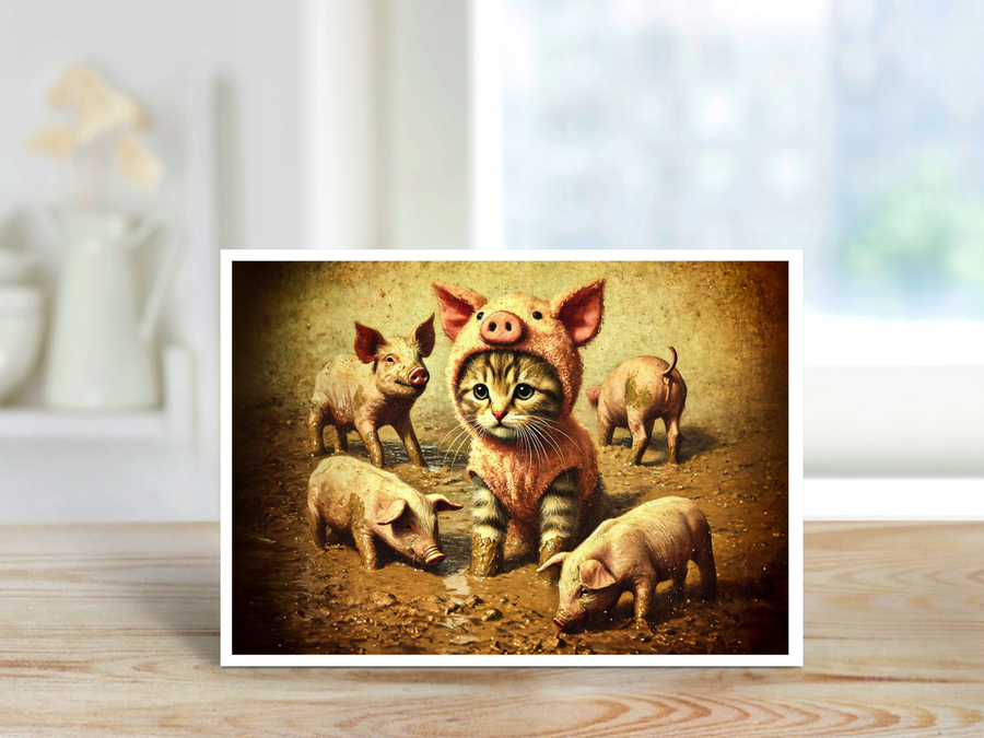 Dressed in an irresistibly cute pig costume, this brave feline wades through the muddy field, blending right in with its squealing companions.