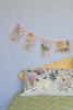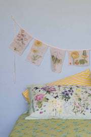 Fill your dreams with flowers in this busy garden of delights. This reversible pillowcase set features vintage illustrations of flowers, birds, bees and insects on the front on a mid minty green background. The back has yummy yellow and pink stripes to create a fresh, happy pillowcase.