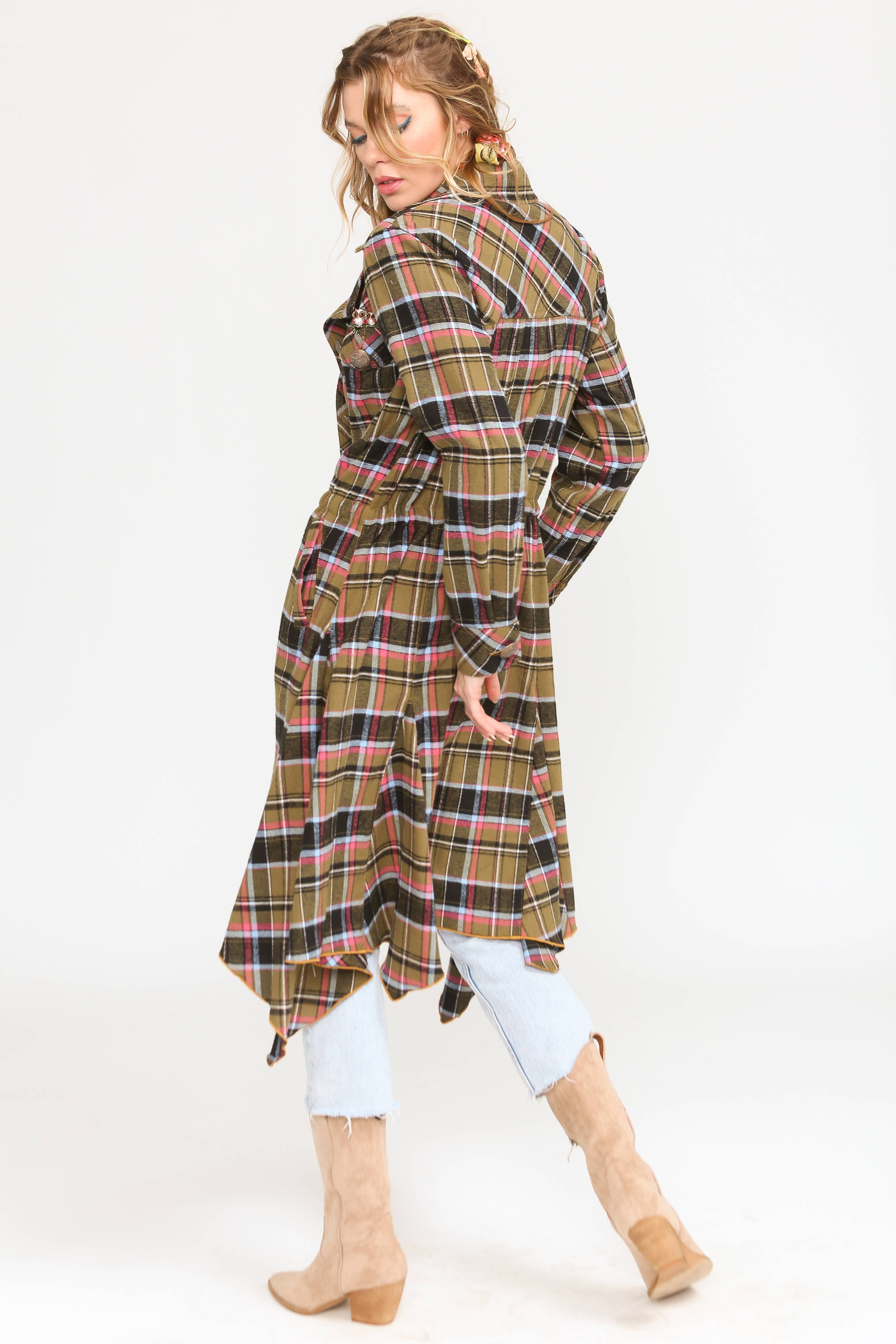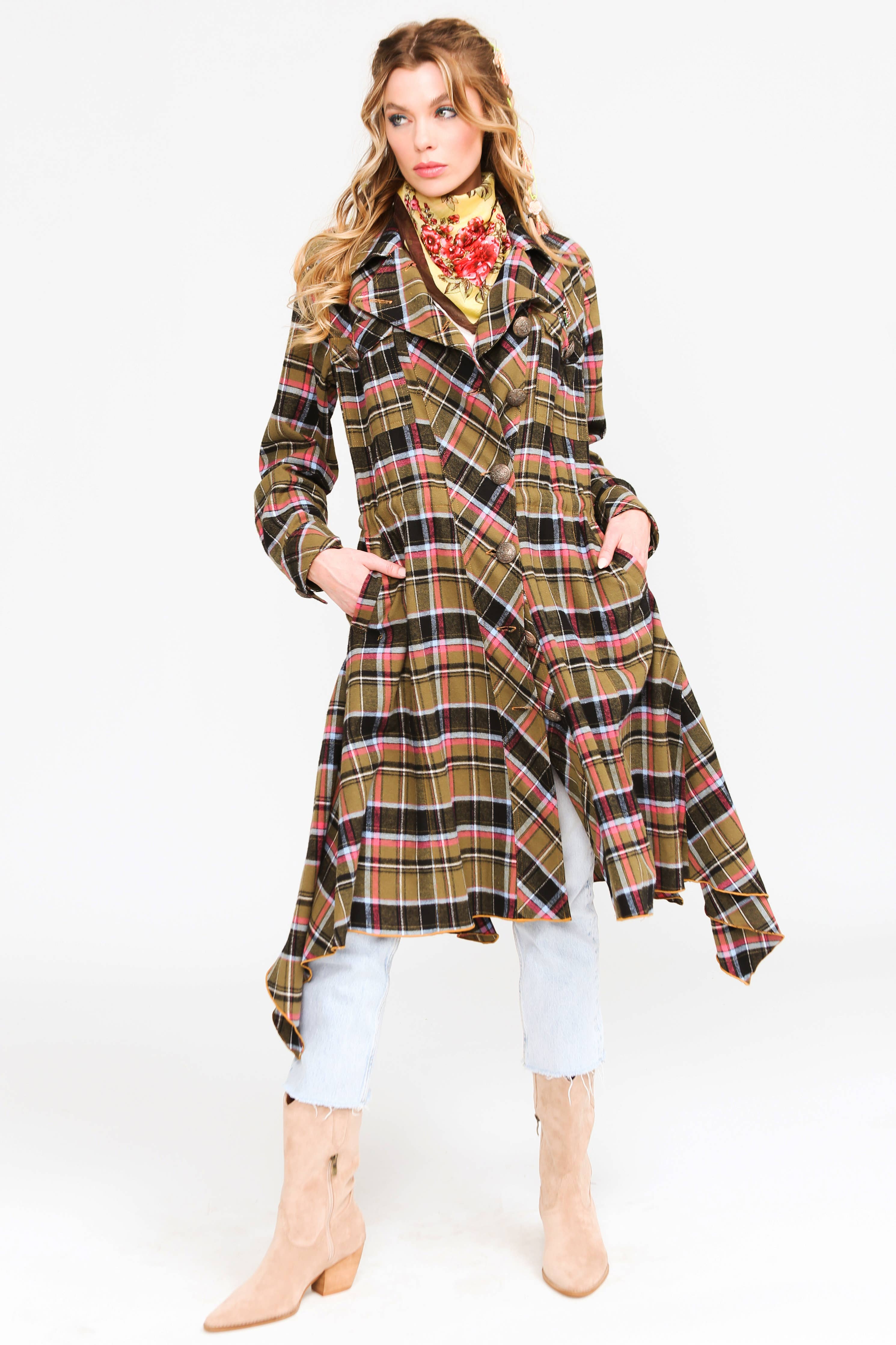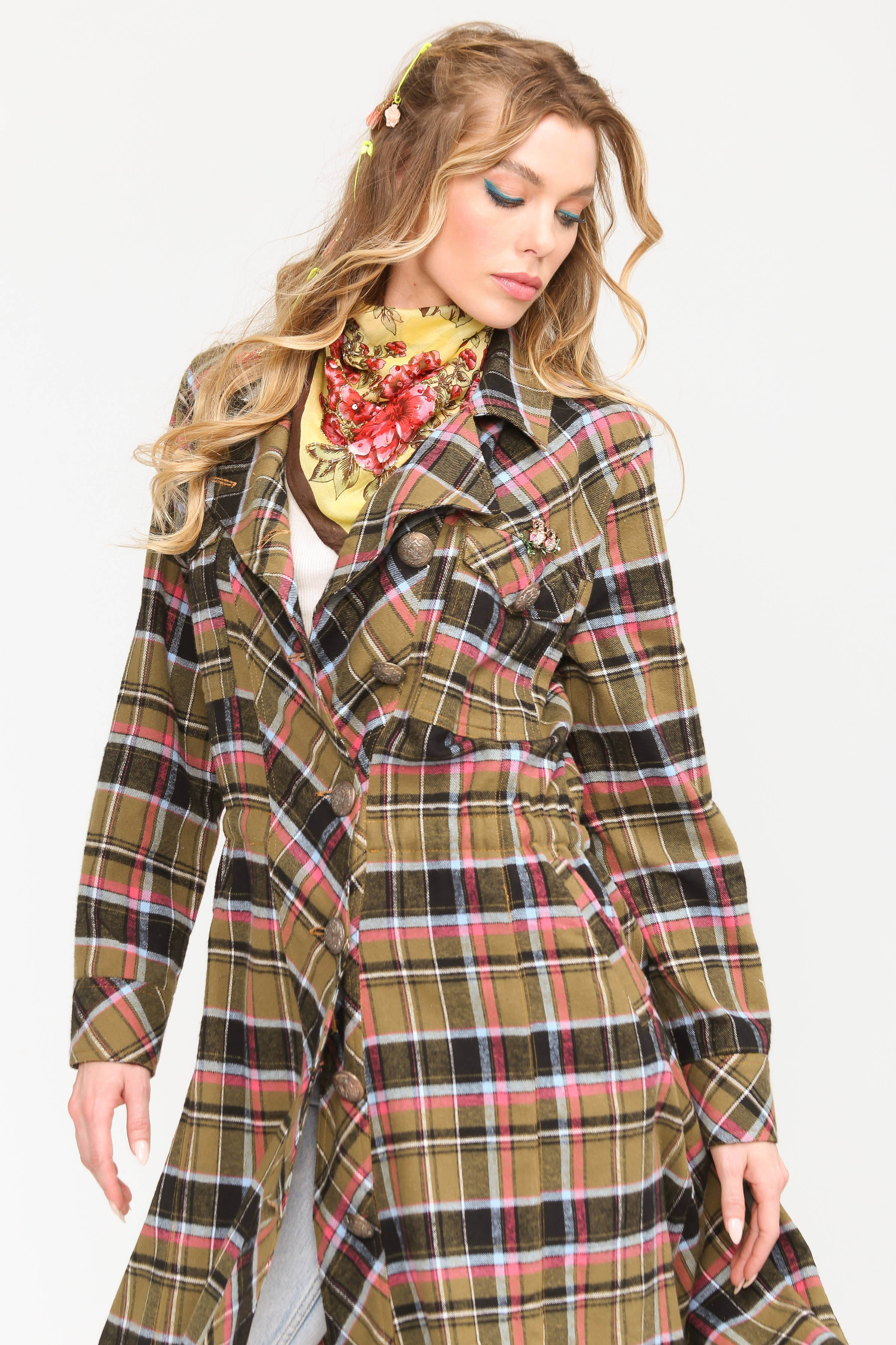 Plaid button-down asymmetrical hem trench coat with owl pin attached to the front pocket, 2 side pockets, 2 front flap pockets * Black/fuchsia combo * Hand wash warm with like colors * Line dry