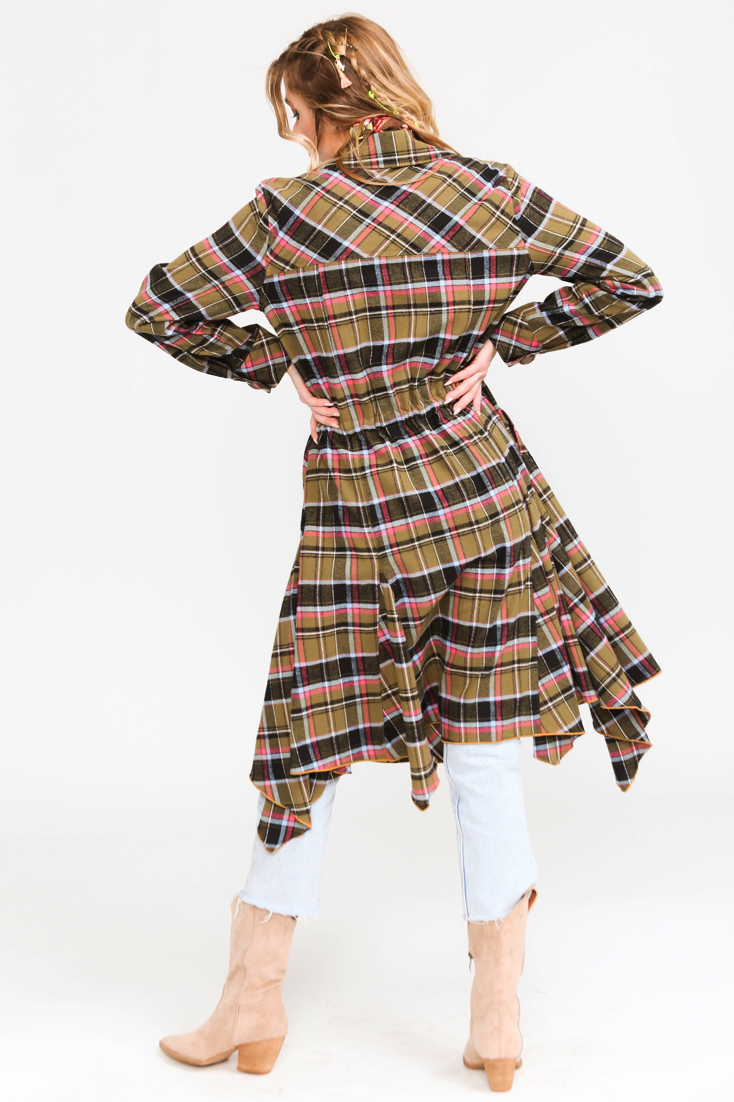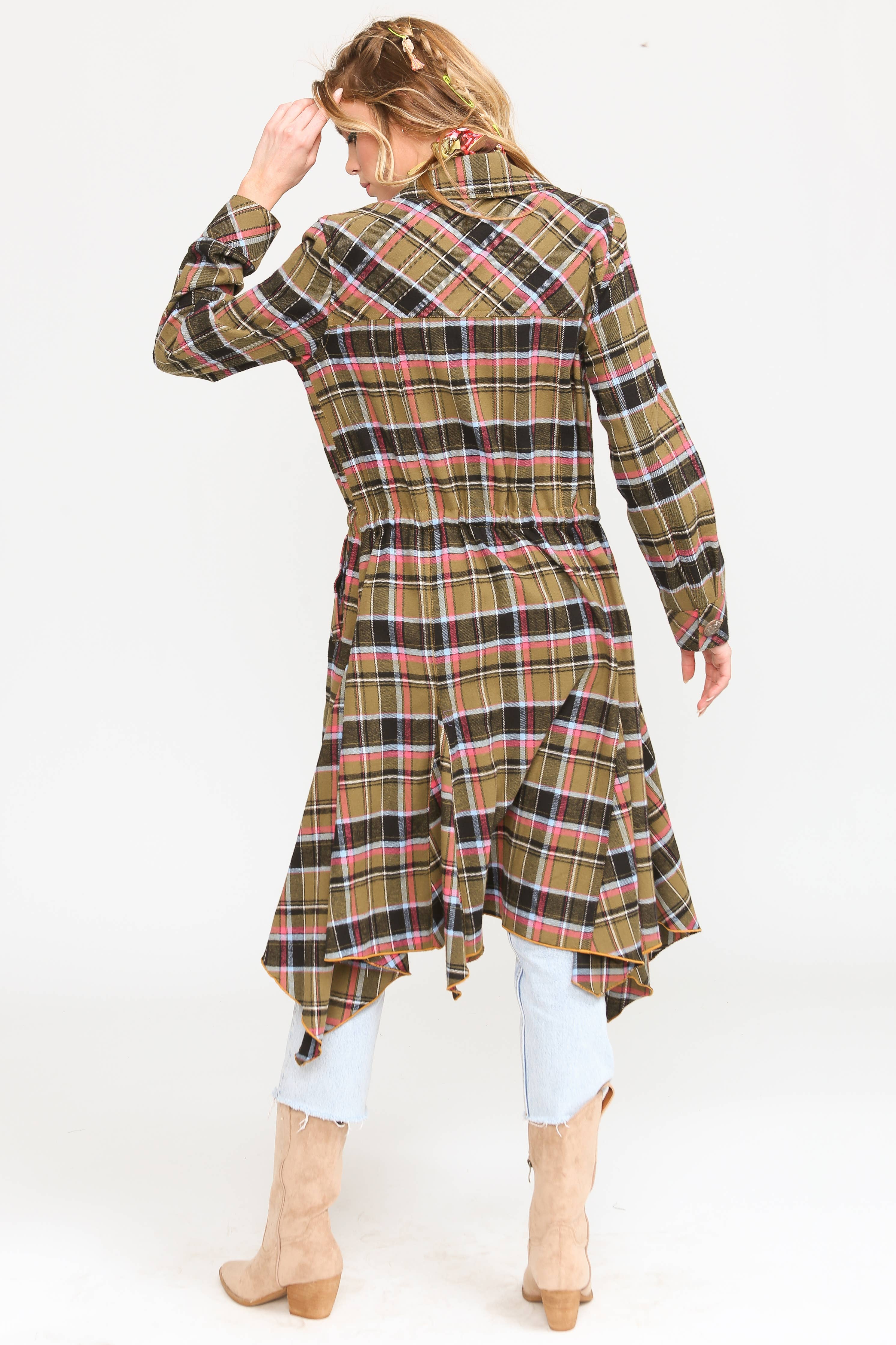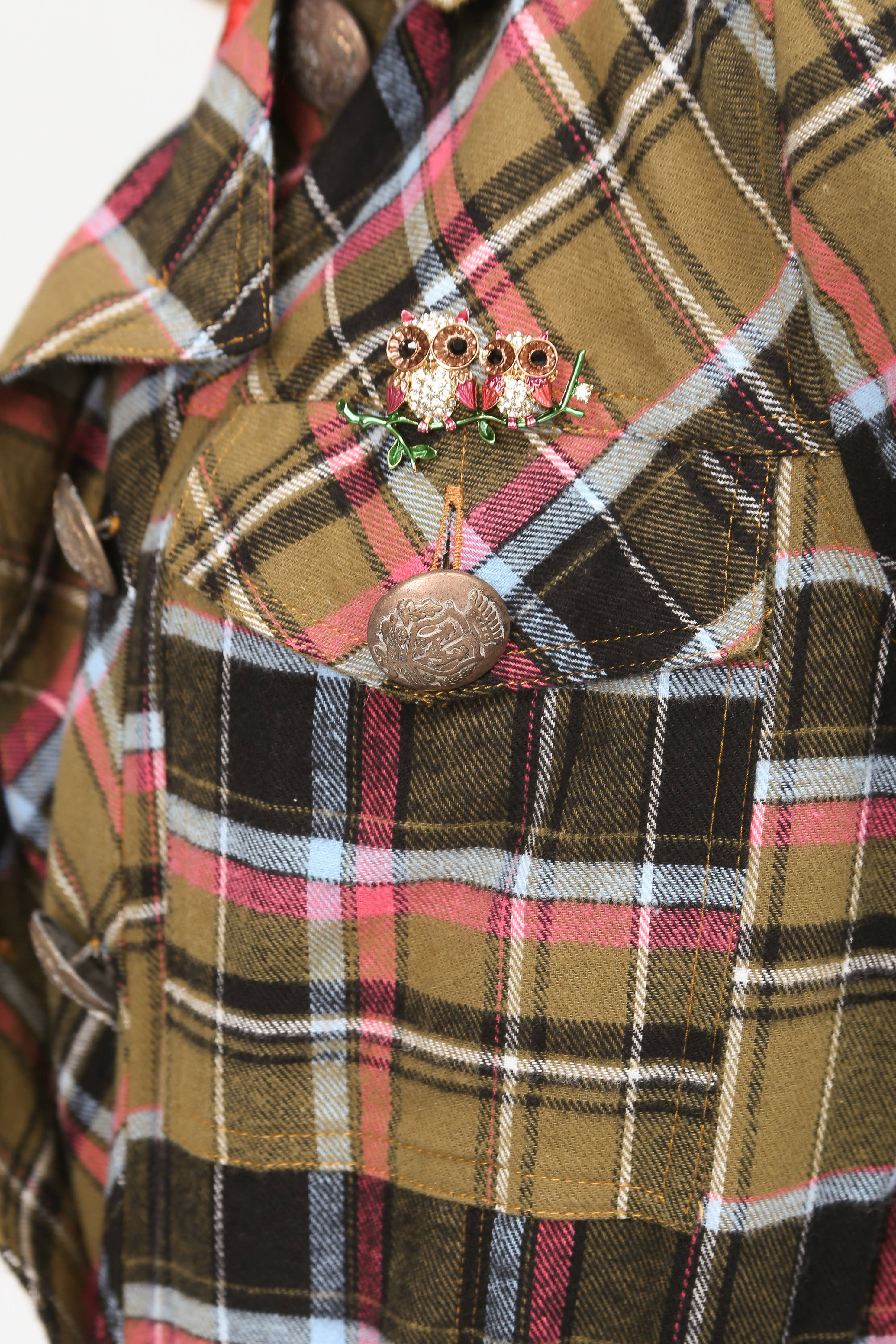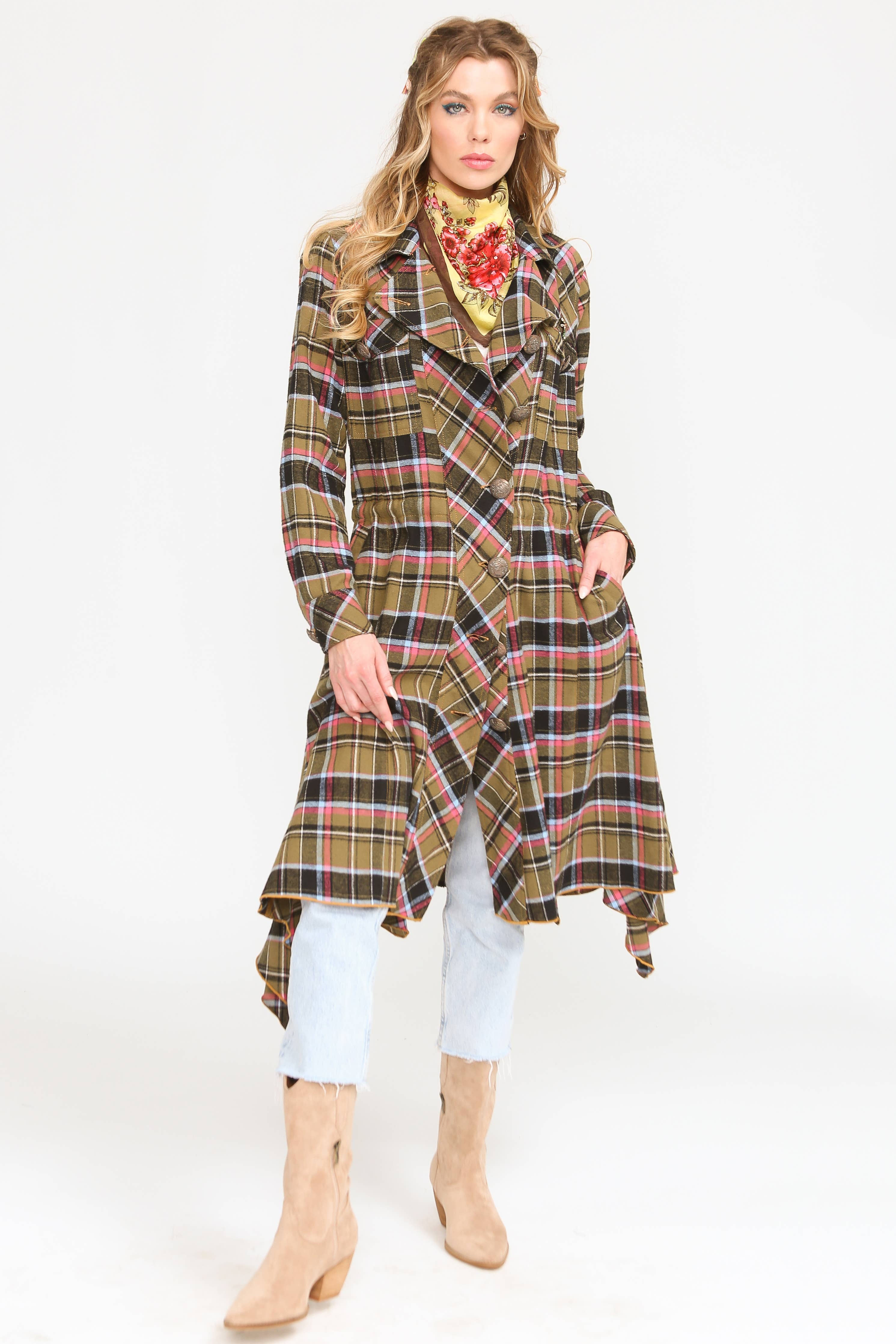 Plaid button-down asymmetrical hem trench coat with owl pin attached to the front pocket, 2 side pockets, 2 front flap pockets * Black/fuchsia combo * Hand wash warm with like colors * Line dry
