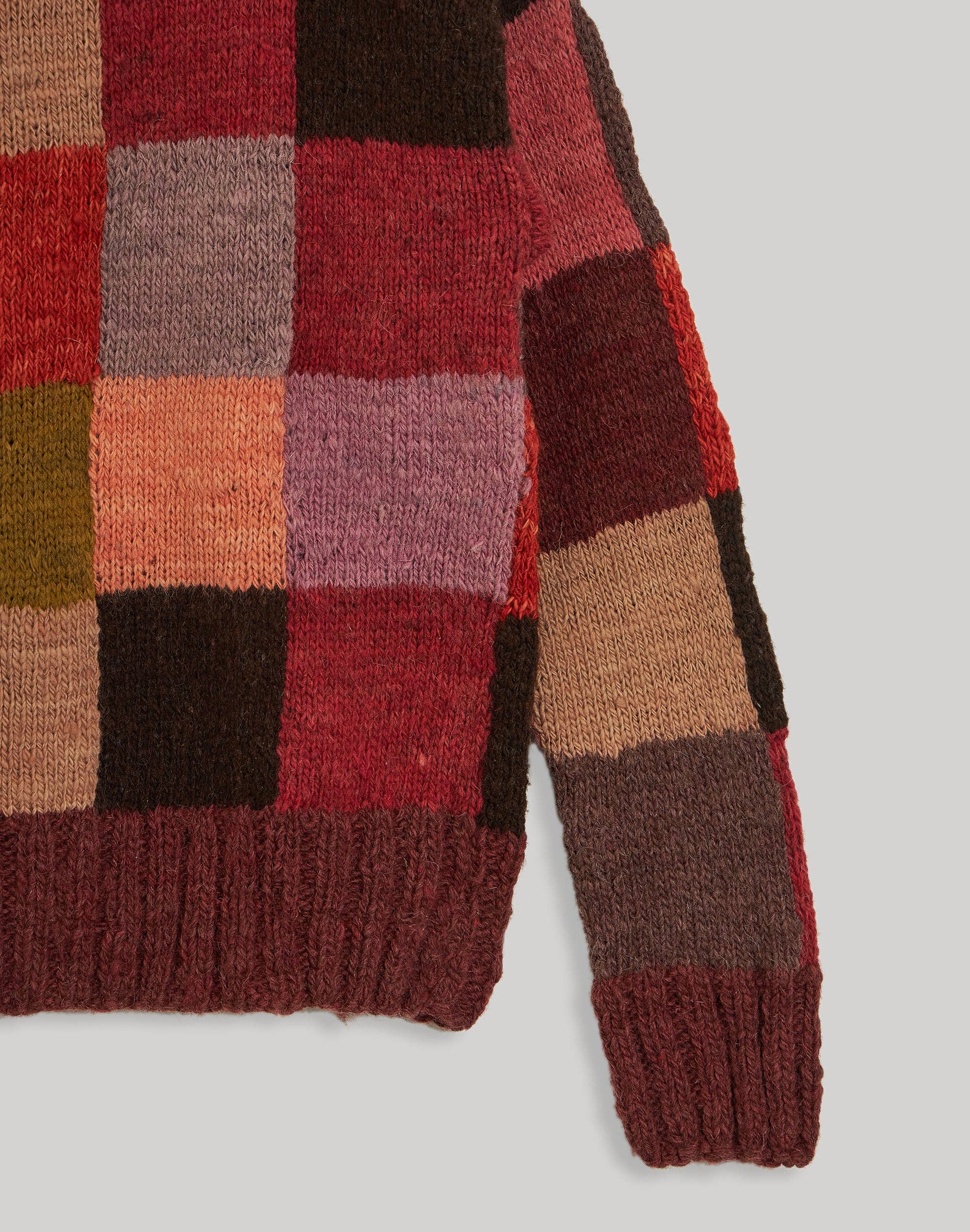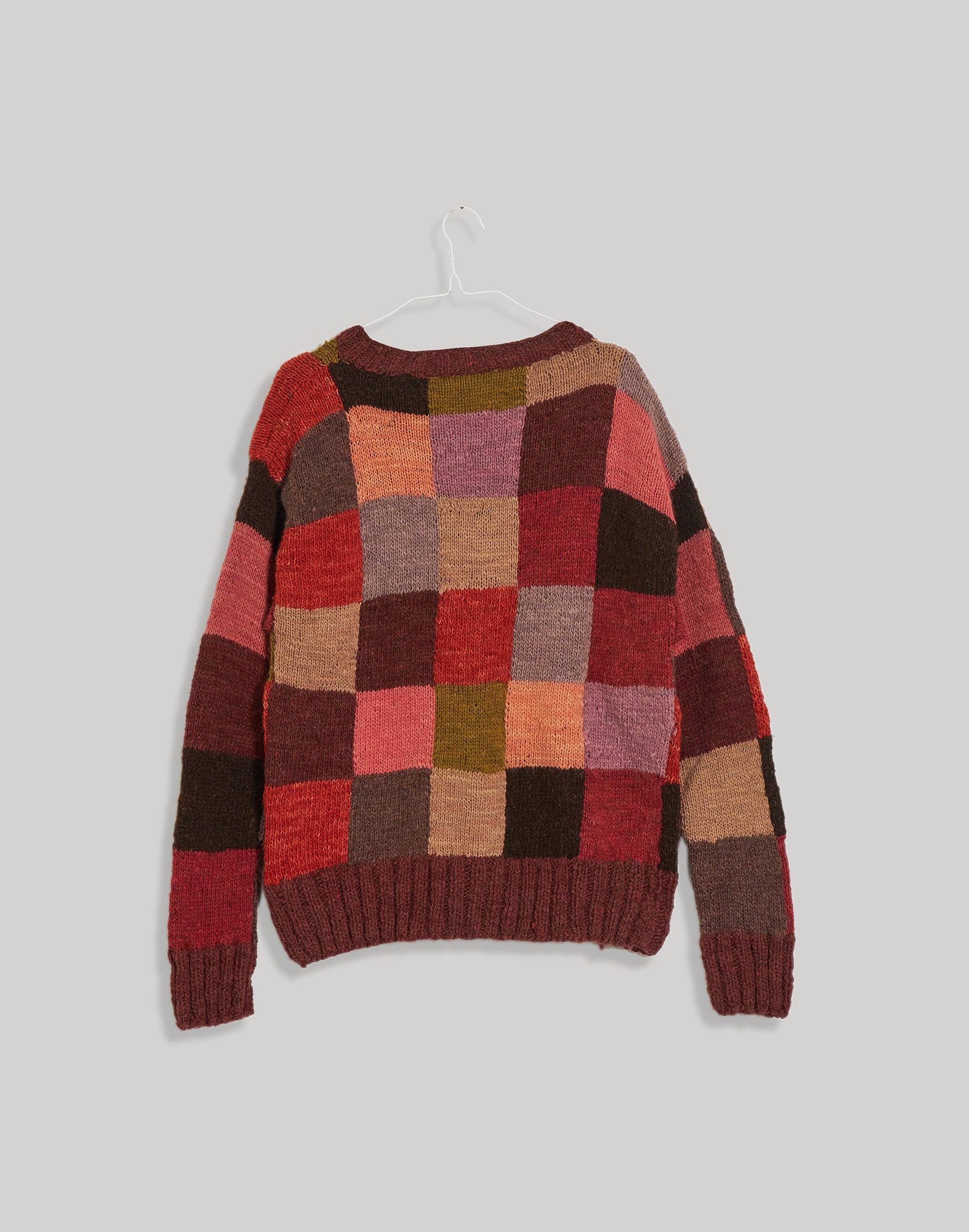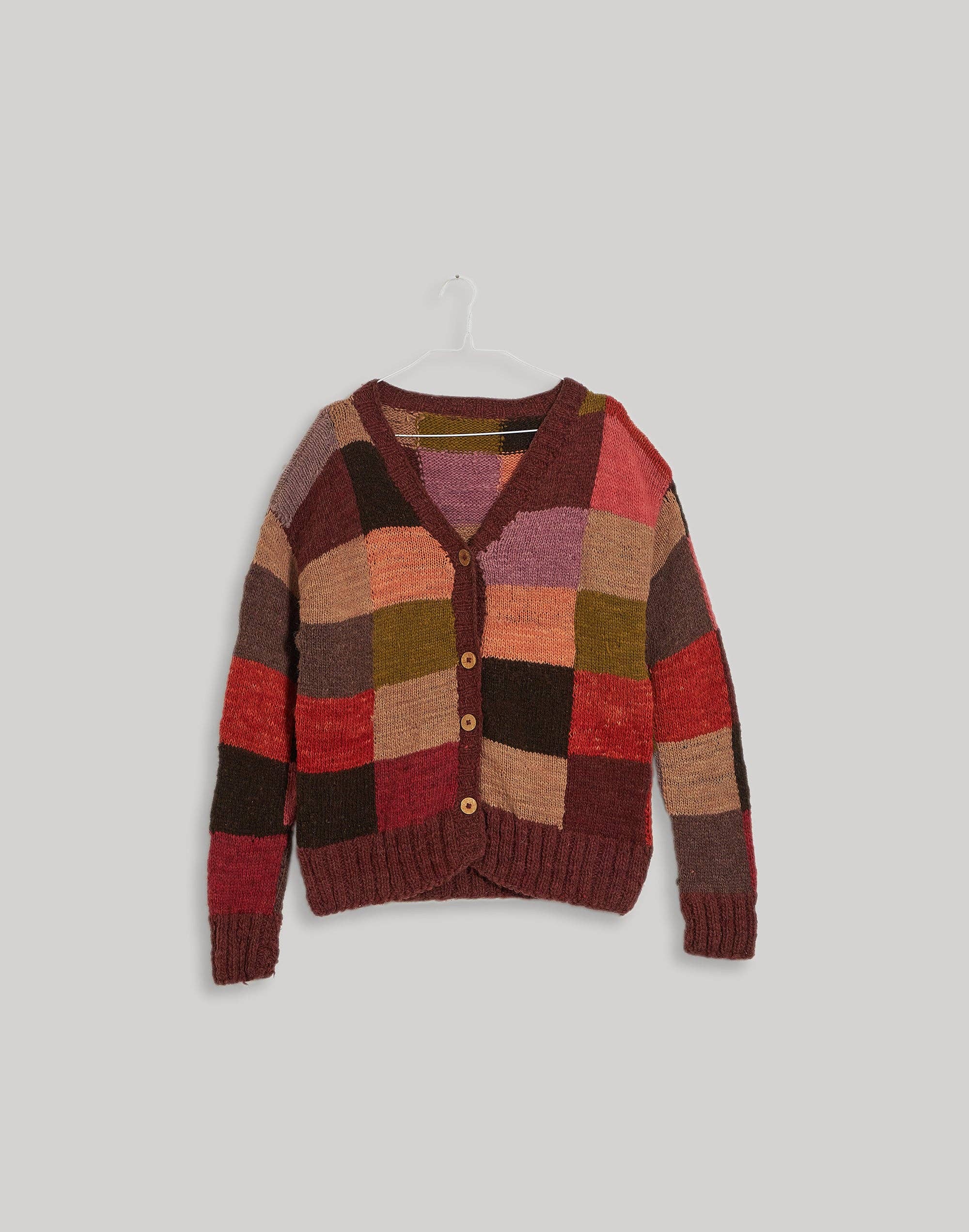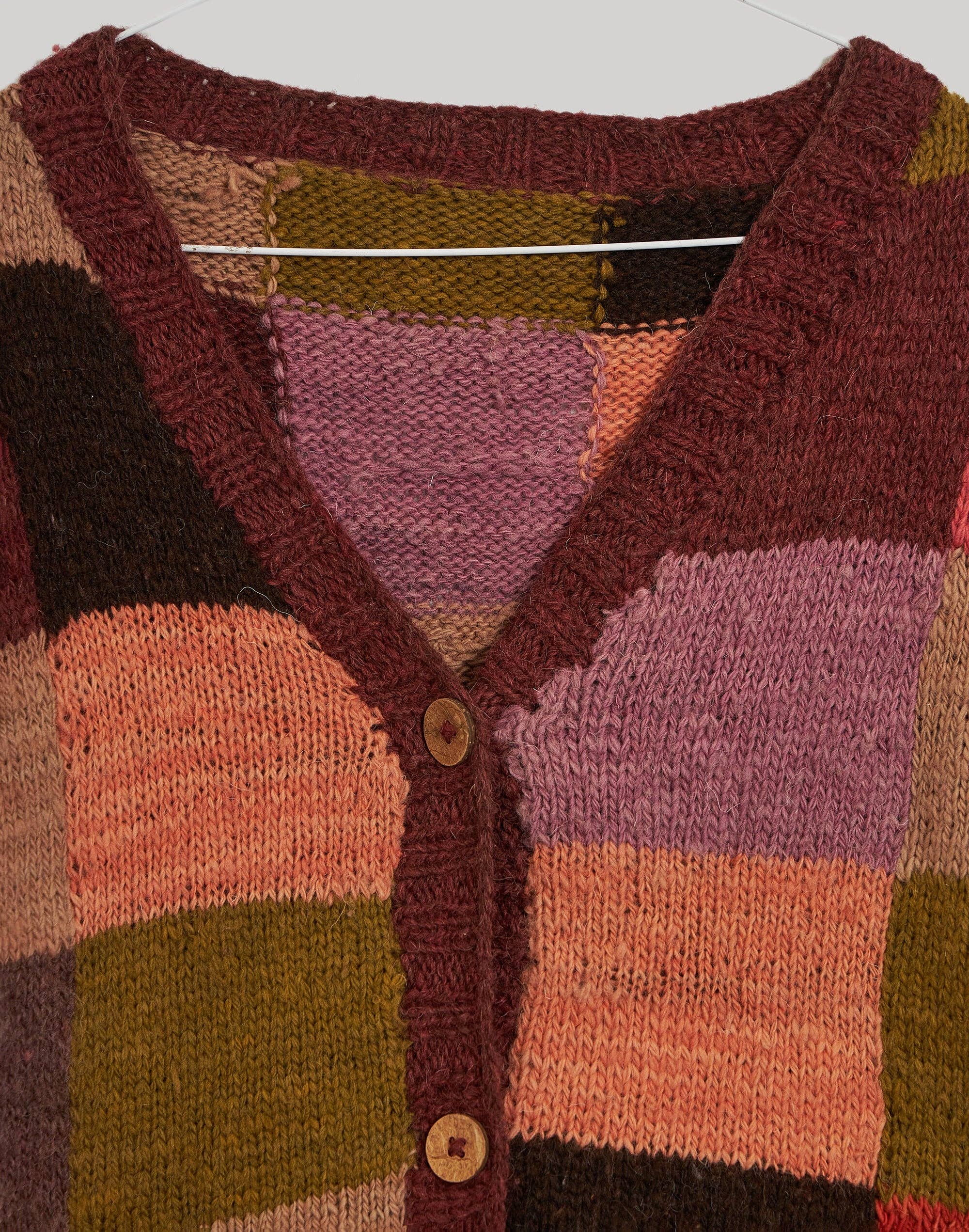 Experience nature's beauty with our Purple Color-Blocked Sweater. This mosaic patchwork piece is skillfully crafted from upcycled, naturally-dyed woollen yarn sourced from our production. Each cardigan is a unique masterpiece, inspired by mountain landscapes, featuring terraced fields, apple blossoms, and snow-capped peaks. Handspun and handknit by our women artisans, every piece is one-of-a-kind in both design and color.