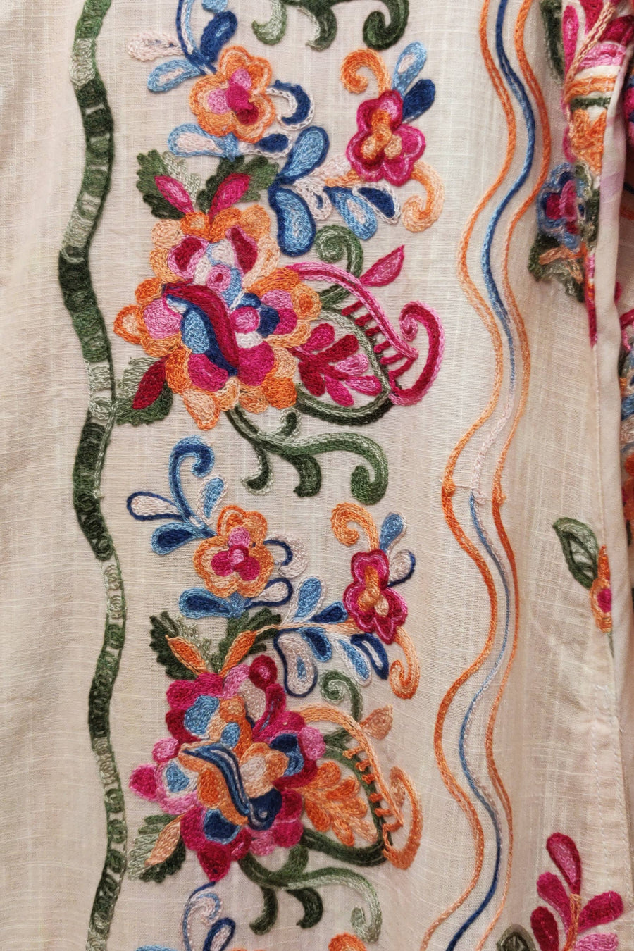 Washed embroidered button-up duster with peacock floral print on the back, 2 side pockets, 2 crystal buttons attached to CF placket, side slits