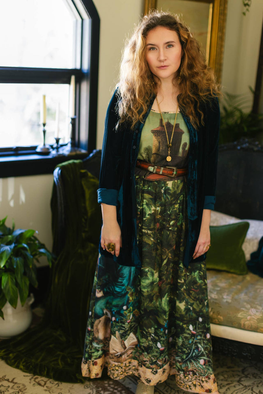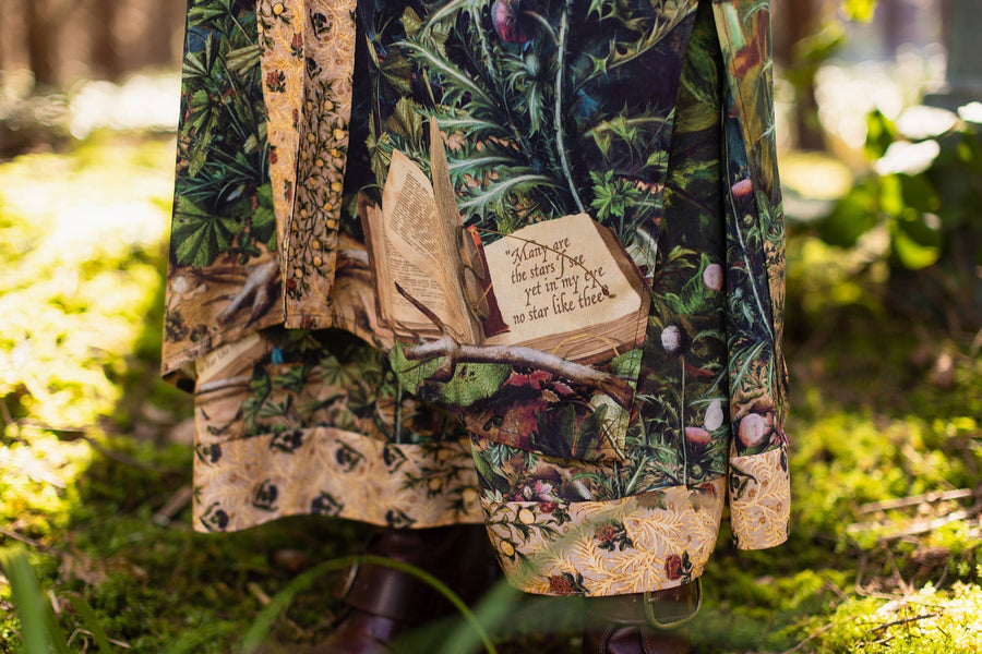 The open book at the bottom of the design reads “Many are the stars I see, yet in my eye no star like thee” — words which we took from an engraving inside the band of an antique gold ring. The beautiful moonlit river landscape on the bodice comes from an 1840's British oil painting, and the exquisite floral trim is from the border of a calligraphic manuscript by William Morris.