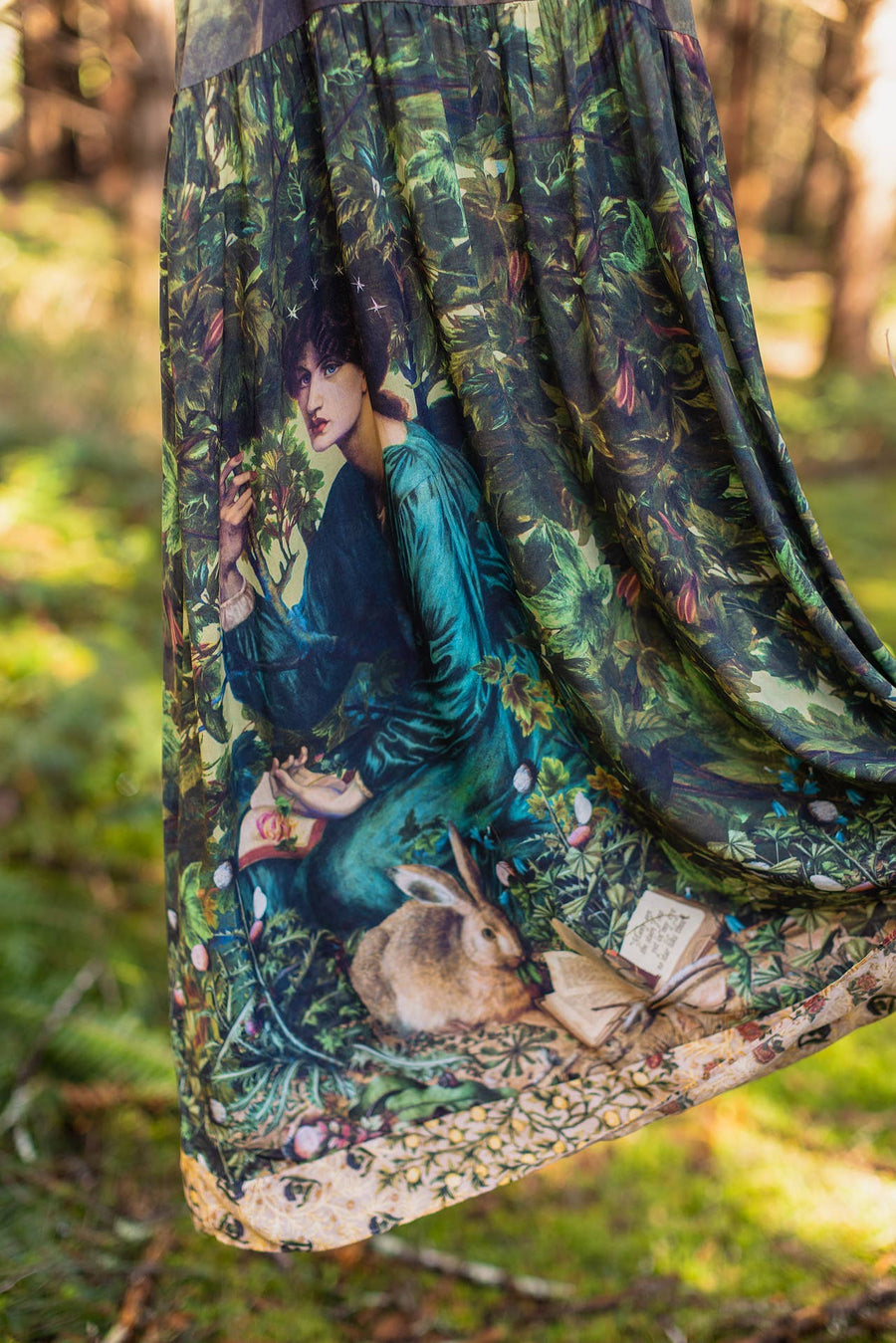 The seated woman in the trees with her dreamy, faraway gaze was painted in 1880 by artist & poet Dante Gabriel Rossetti, while the charming rabbit comes from a much earlier painting done in 1585.