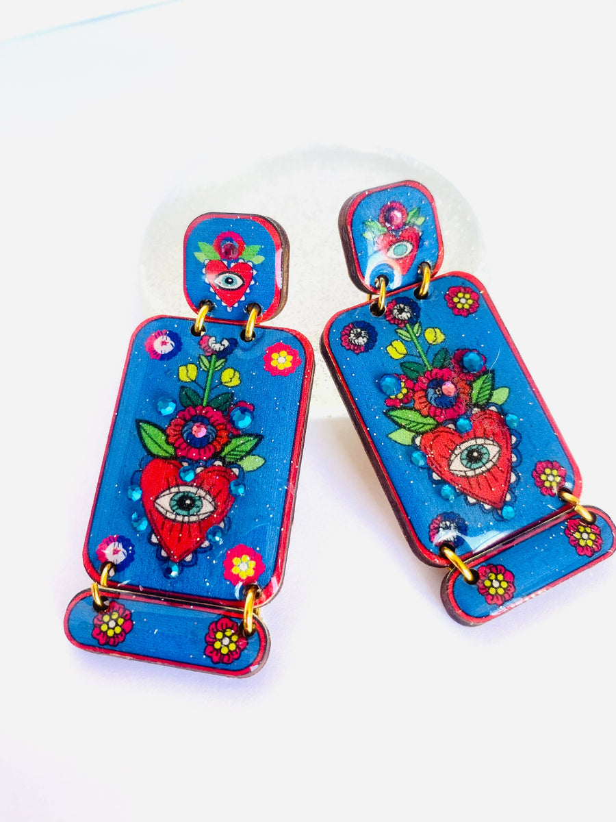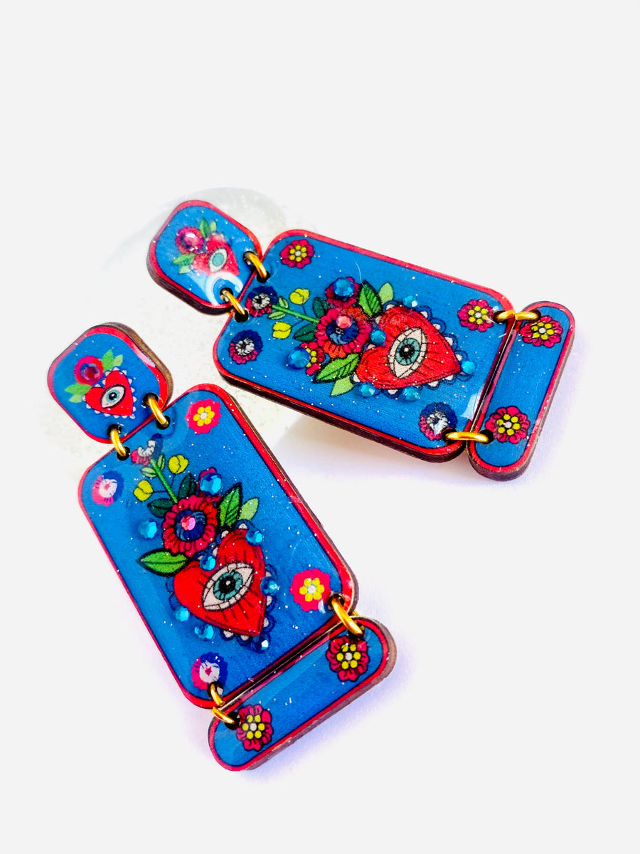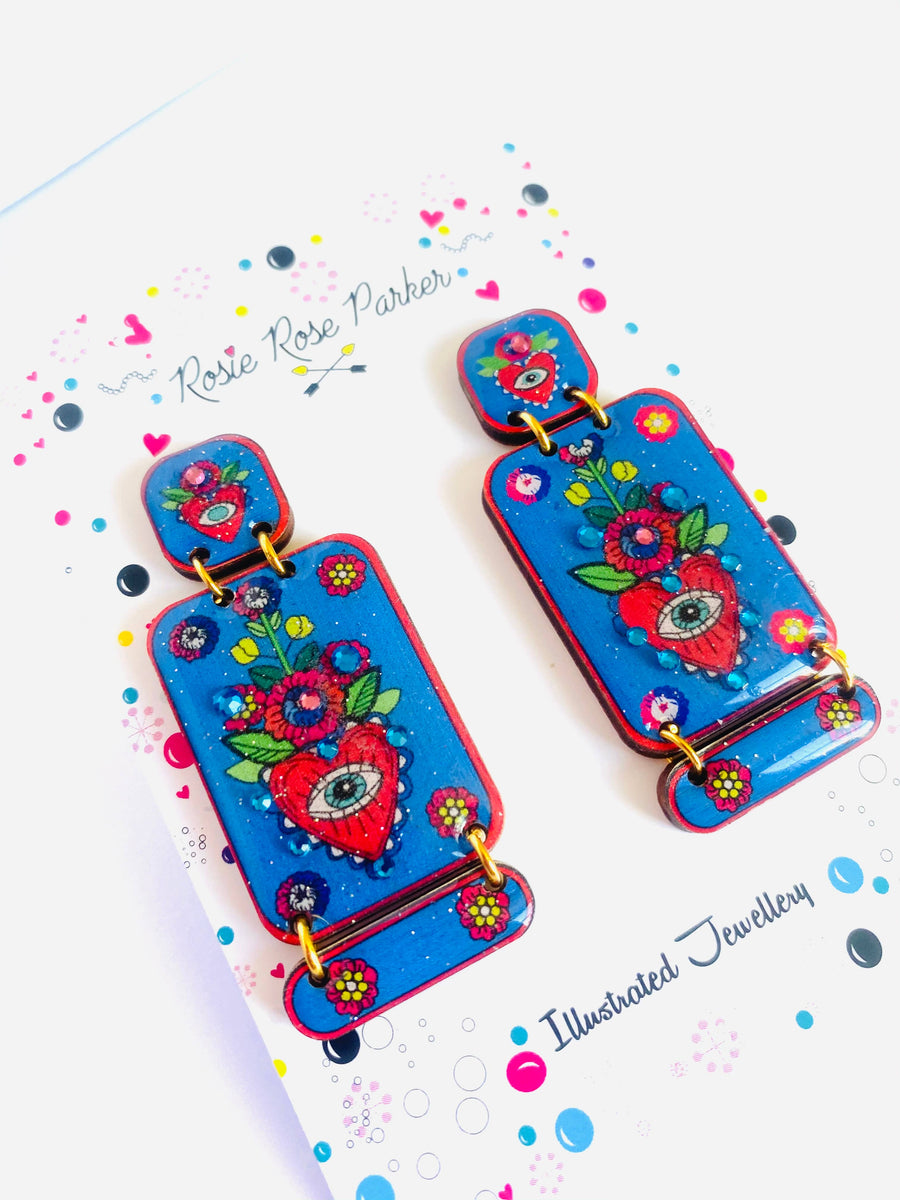 "The beautiful Botanical Bouquet Earrings" Stunning and beautifully made blue illustrated botanical style garden earrings in bright blue with eyes 👀 so beautifully made with added hand placed gems.
