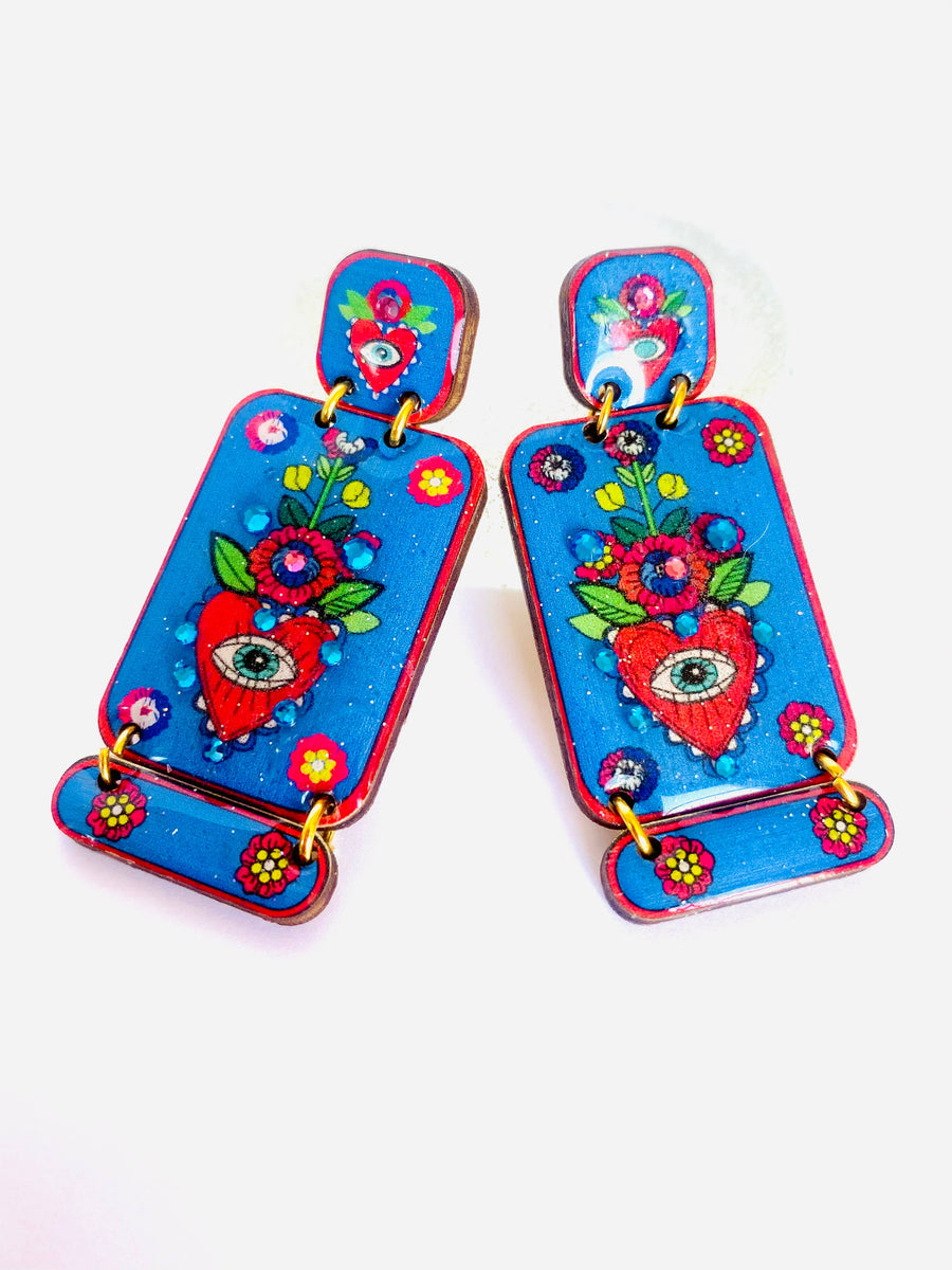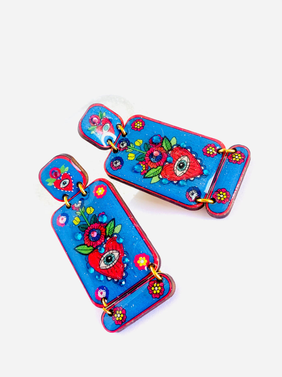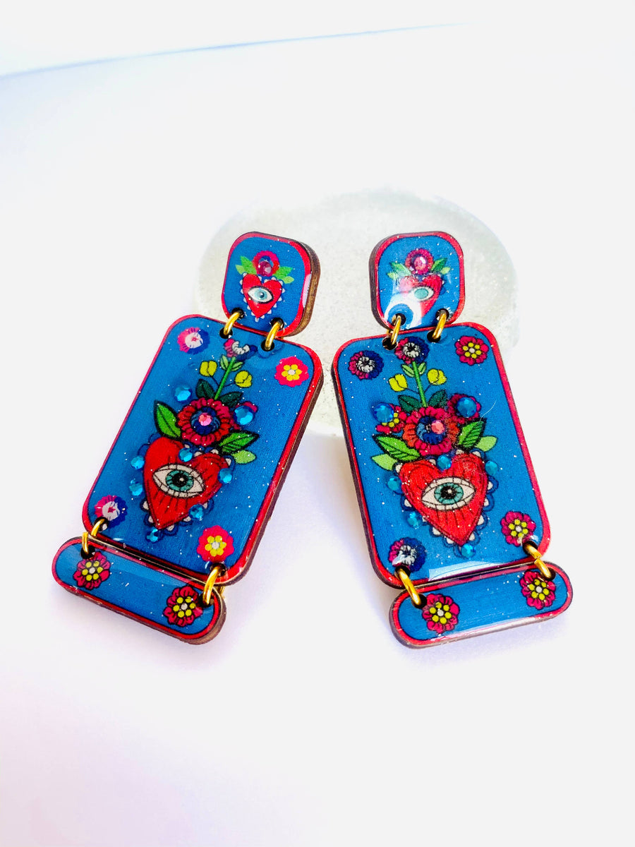 "The beautiful Botanical Bouquet Earrings" Stunning and beautifully made blue illustrated botanical style garden earrings in bright blue with eyes 👀 so beautifully made with added hand placed gems.