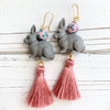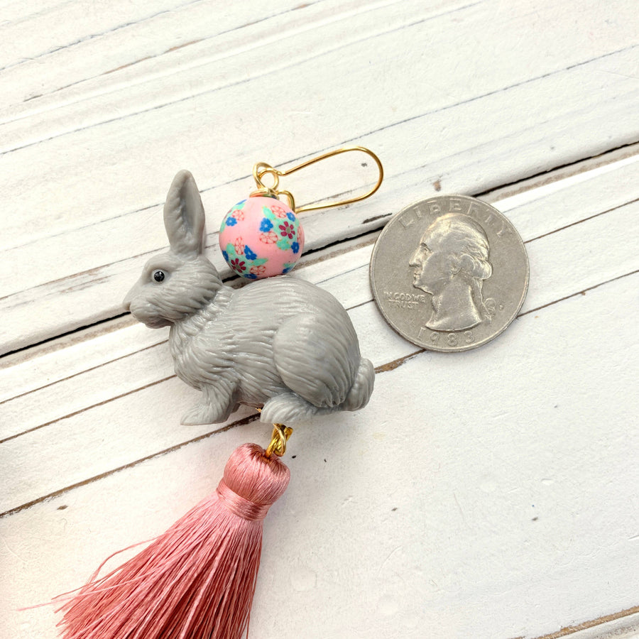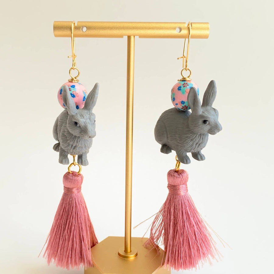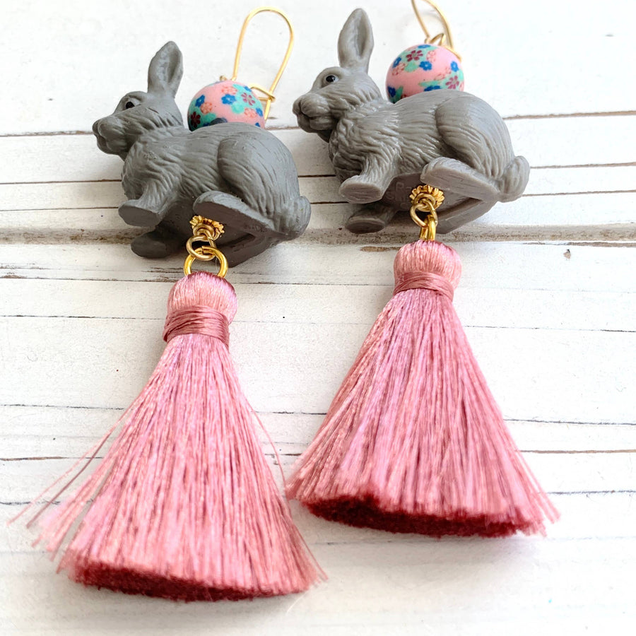 Make a statement with these fun and unique bunny earrings with floral fimo beads and dusty rose silk tassels. 4"L.