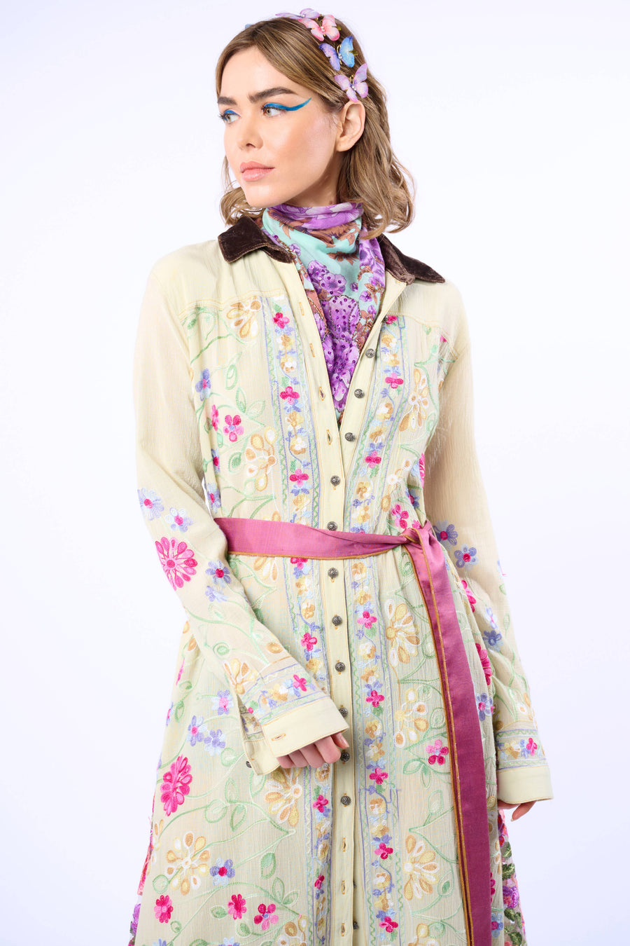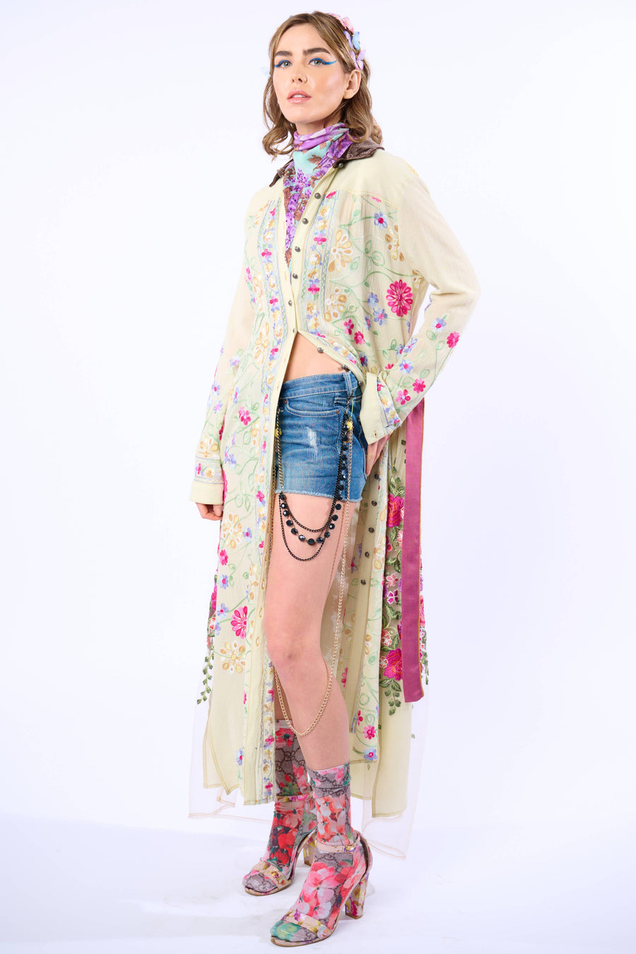Washed floral embroidered long-sleeve button-down duster with satin collar/collar stand, mesh back yoke and floral embroidered mesh back, satin belt, metallic buttons closure on center front placket and sleeve cuffs, side slits * Pastel sage * Dry clean only *