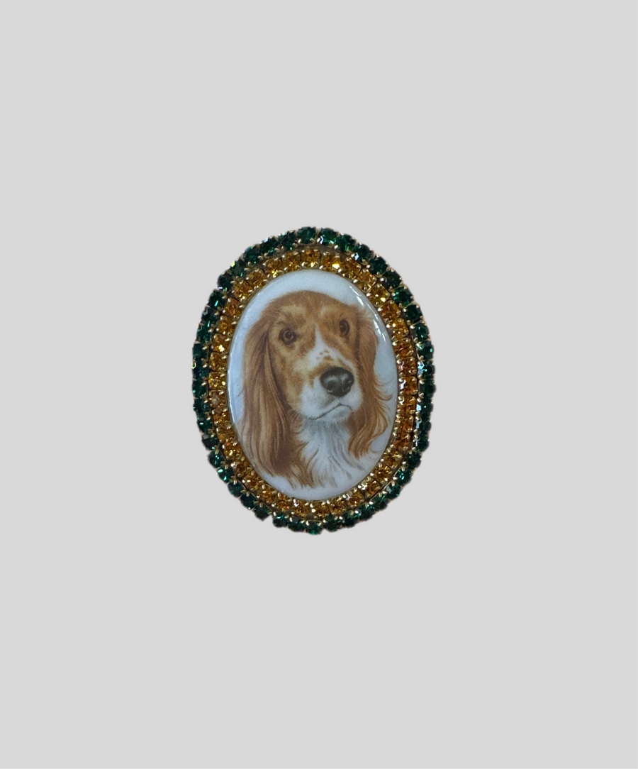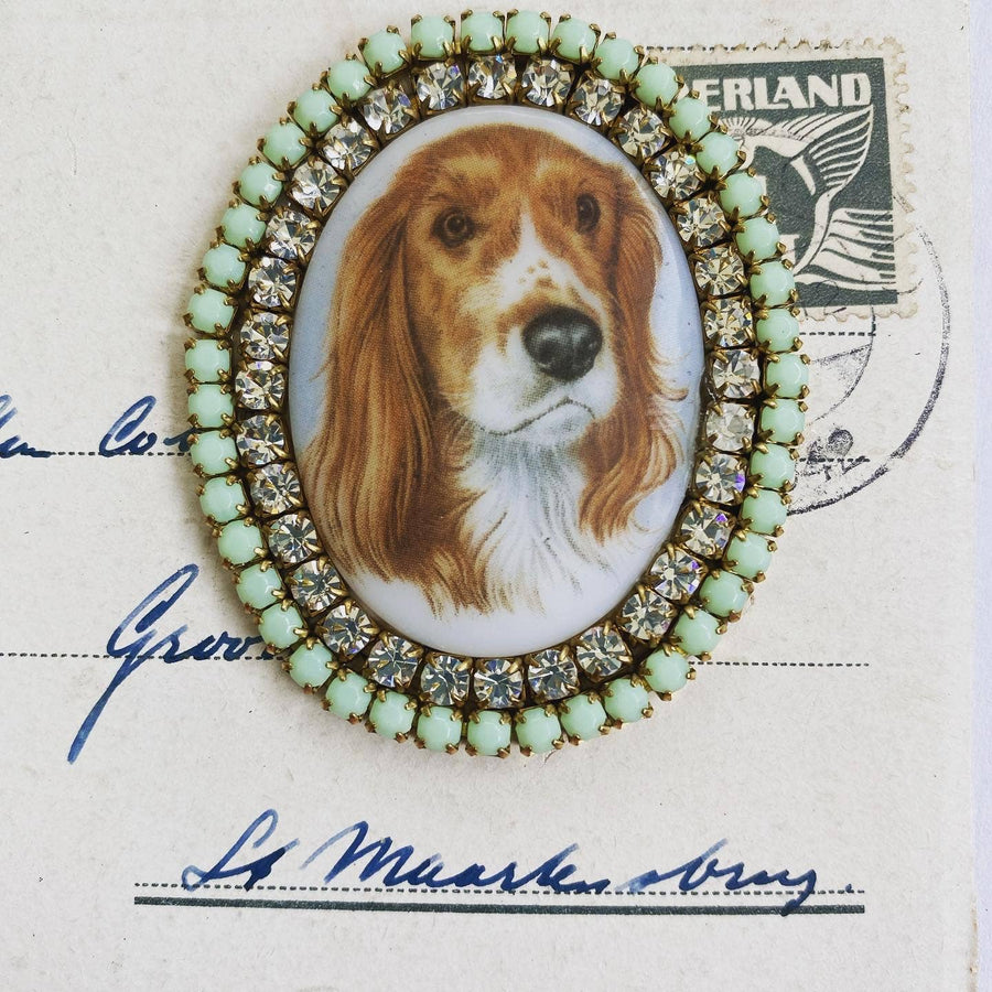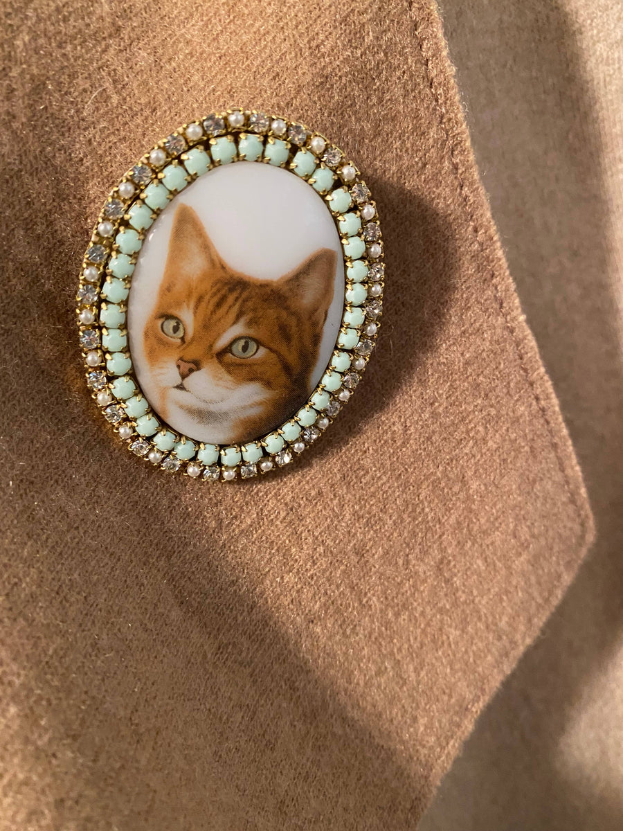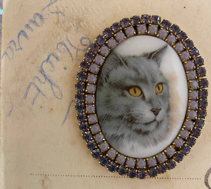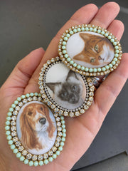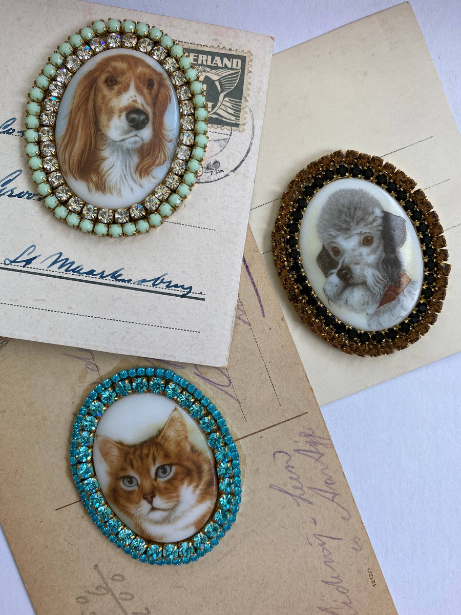 Oval cabochon brooches with images of dogs and/or cats surrounded by high quality rhinestones.