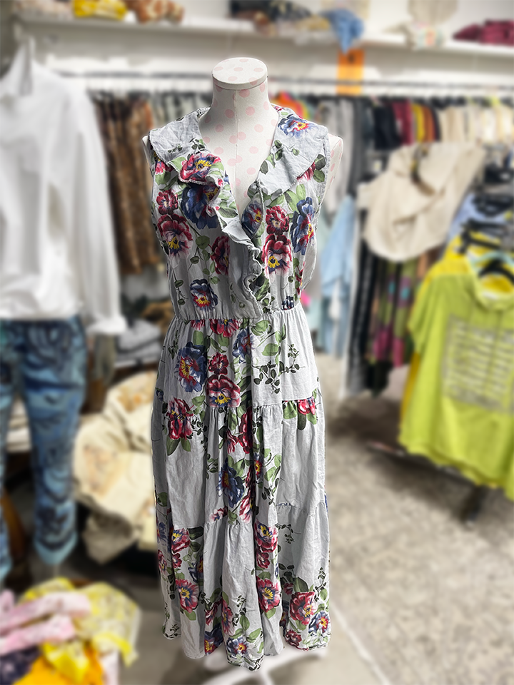 Sleeveless, light blue with multi-colored floral design, maxi-dress.