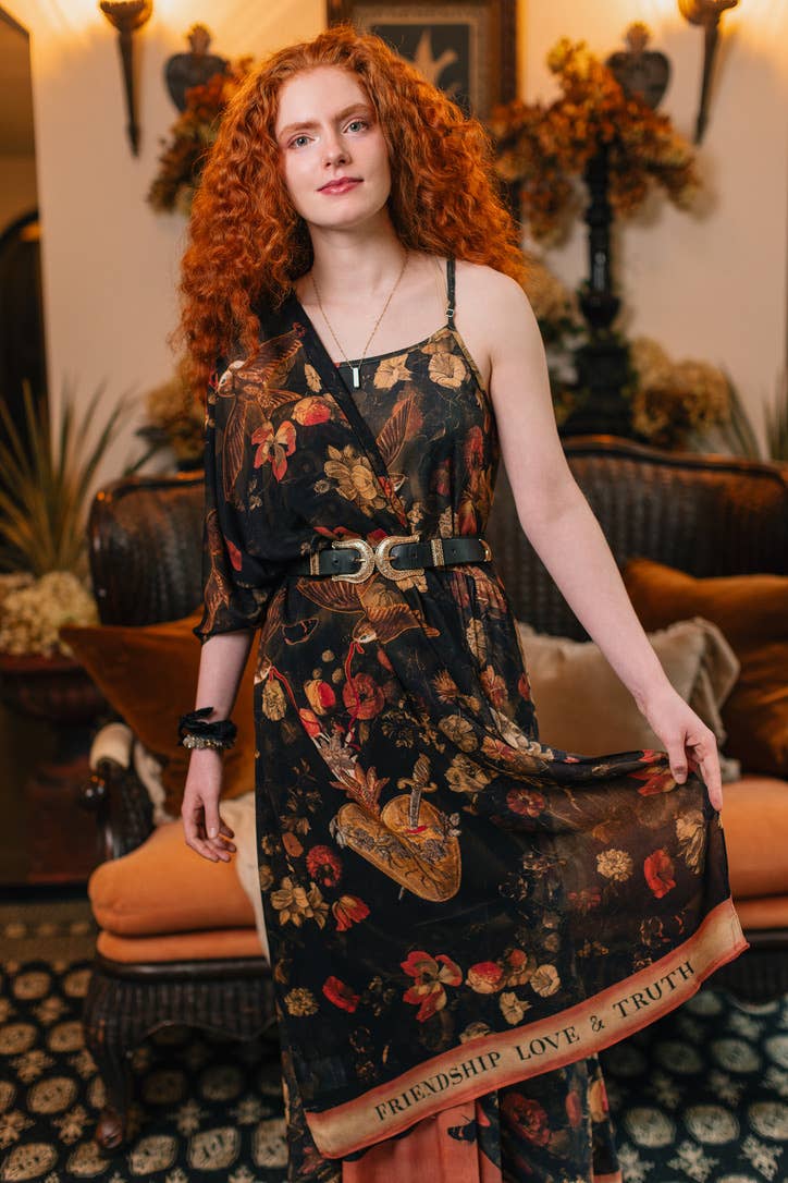 100% viscose (derived from plant fibres such as wood and bamboo). Handwash, hang to dry. 68cm x 155cm. boho bohemian gypsy vintage antique garden nature spring elegant botanical