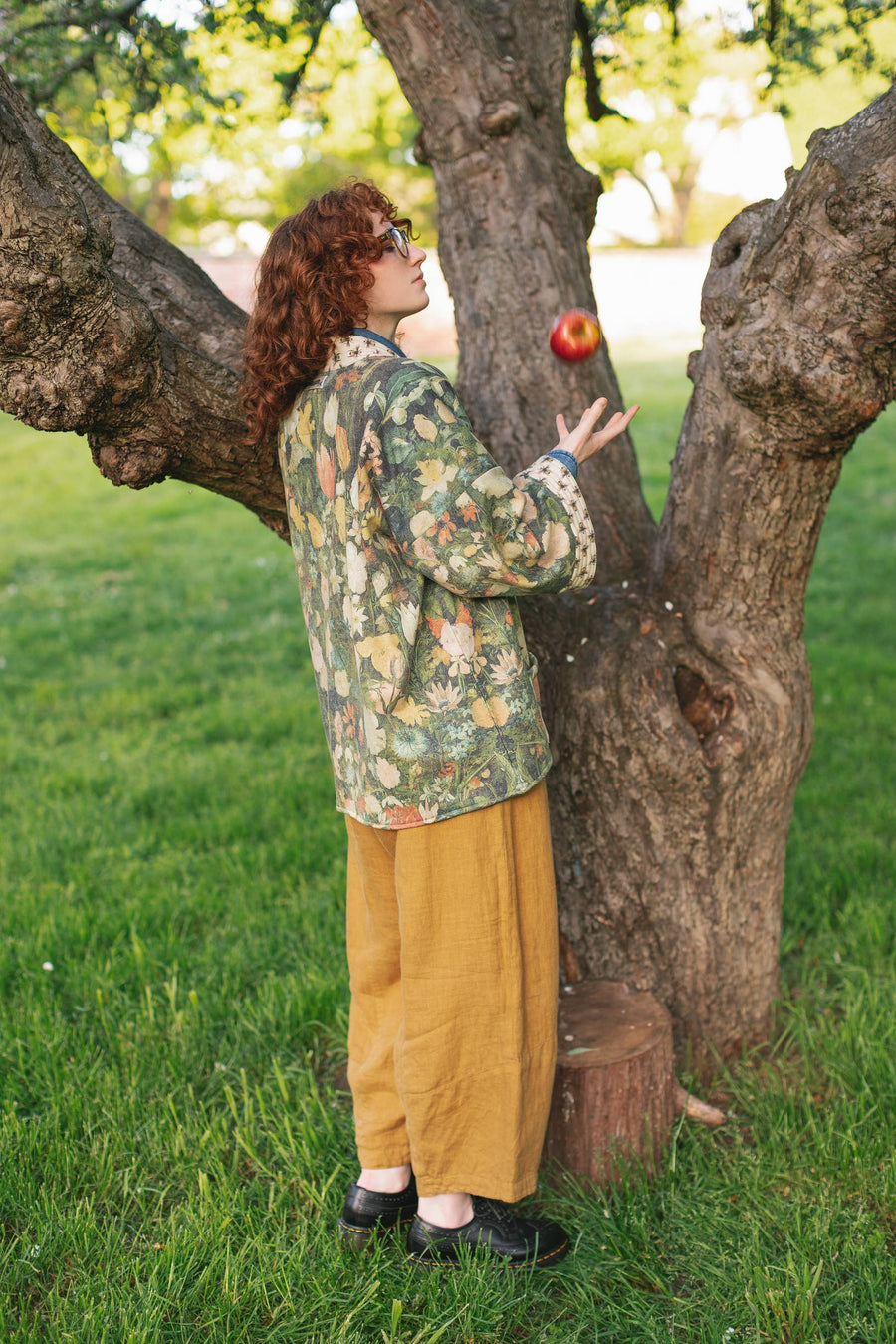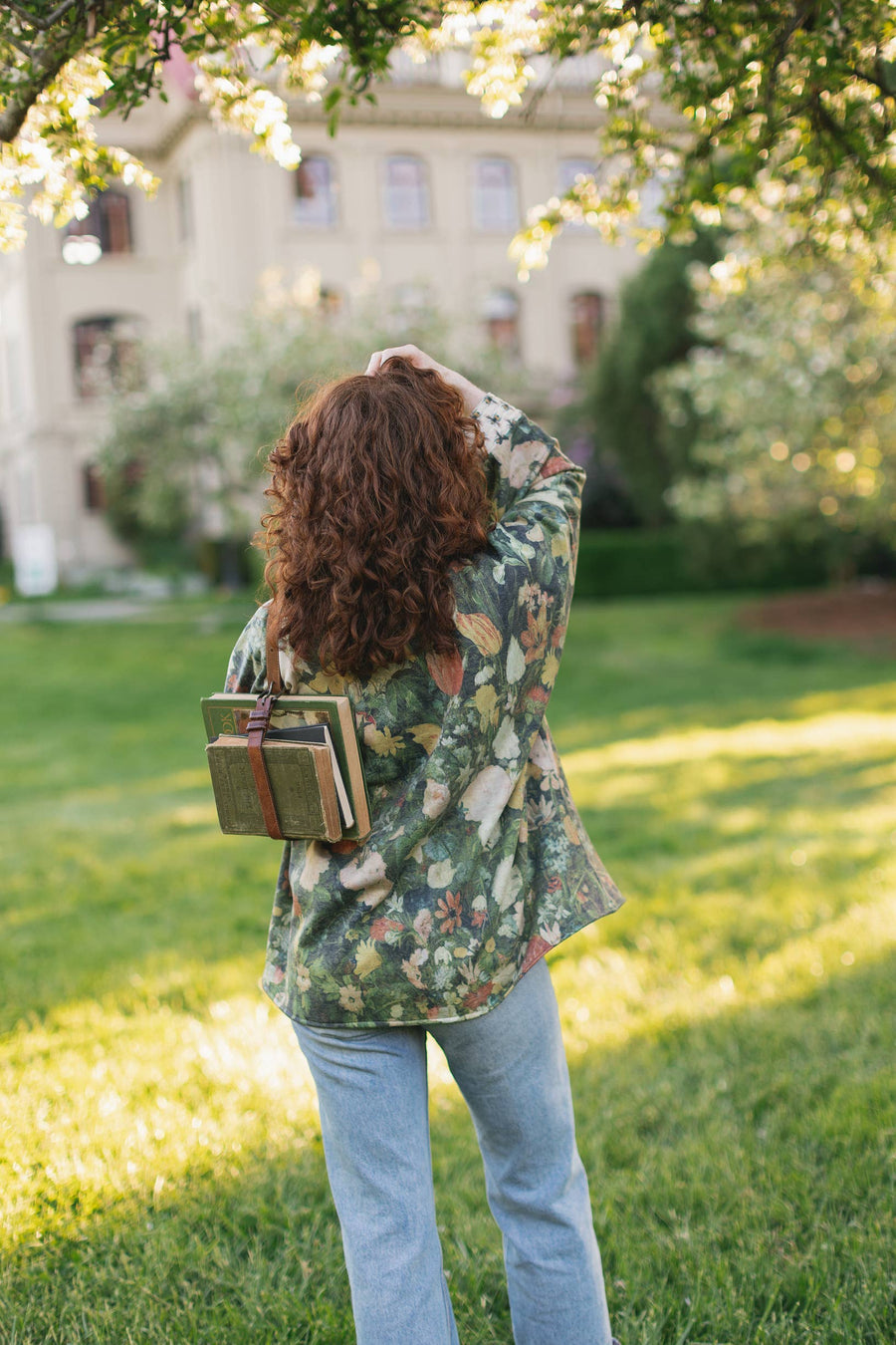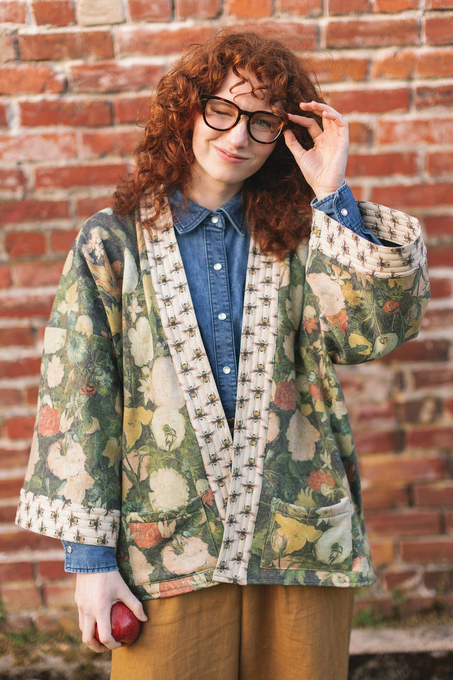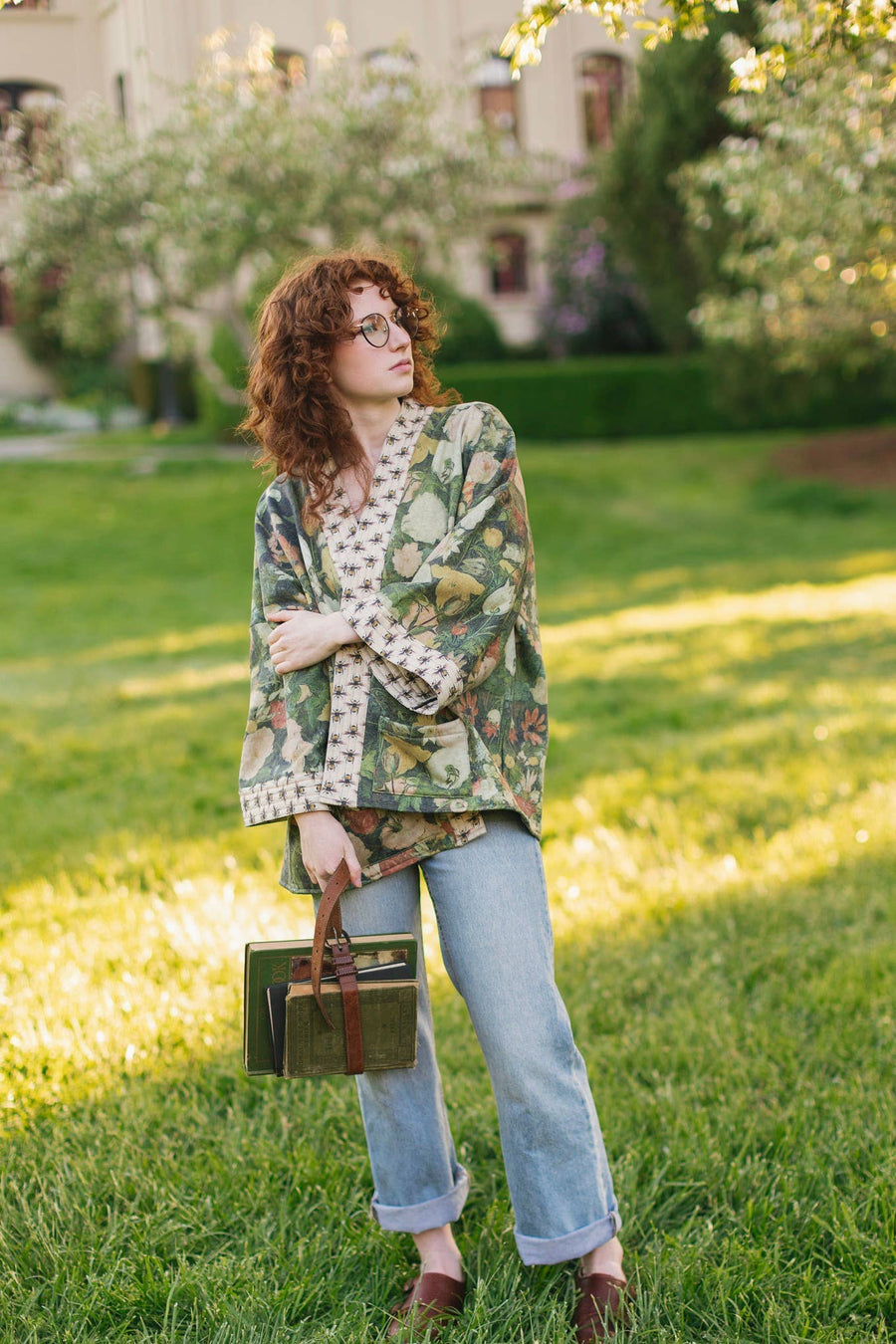 After many months of development, we're so excited to welcome this special new piece to our collection for cooler days! A riotous, painterly celebration of art and the natural world, this luxe cardigan is all at once romantic, ethereal, and so so cool. Inspired by the romance of European flower markets, we created the print using a masterful oil painting from the early 1600’s by artist Jan Brueghel, and an ink drawing of bumblebees we found in a Victorian insect encyclopedia.