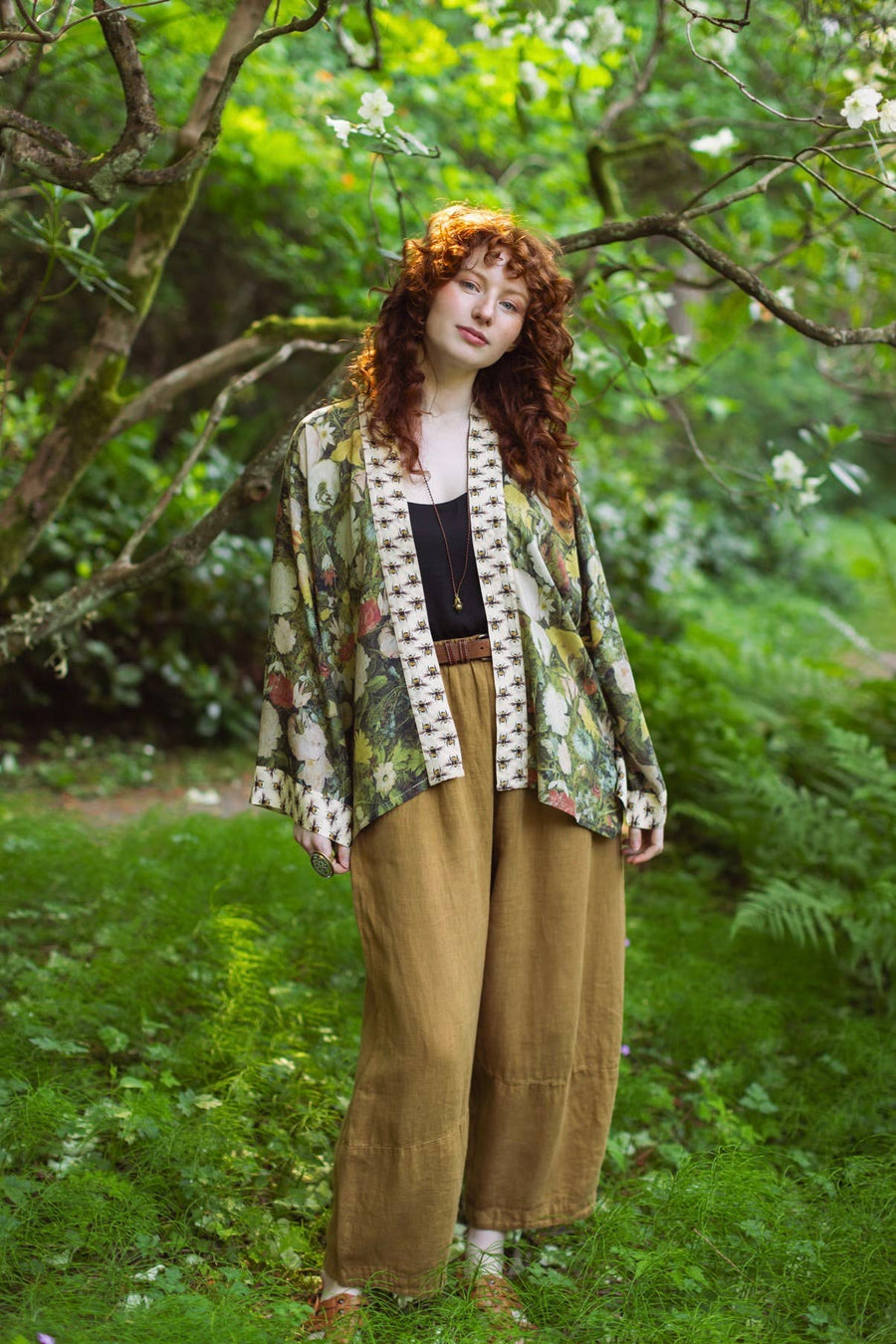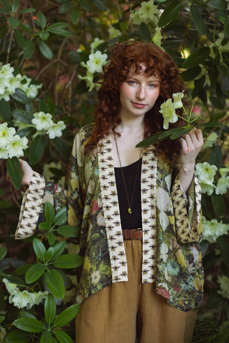 Inspired by the romance of European flower markets, we created this kimono using a masterful oil painting from the early 1600’s by artist Jan Brueghel, and an ink drawing of bumblebees we found in a Victorian insect encyclopedia.