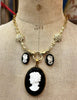 The central one represents two hands holding a ring, a vintage ceramic cameo, and two small black cameos Total length 45cm - pendants 4/2cm