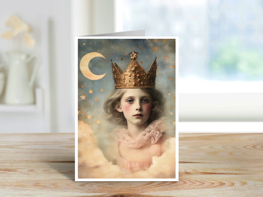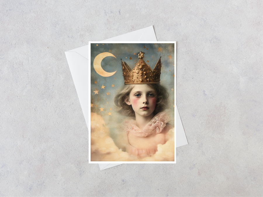 Enter a celestial dreamscape with this enchanting card featuring a young princess crowned in gold, surrounded by a sky full of stars and a glowing crescent moon. Her soft gaze and delicate lace collar evoke an ethereal beauty, as if she has stepped right out of a fairy-tale. Perfect for whimsical greetings or messages filled with wonder, this card captures the magic of the night sky and the innocence of youthful royalty.