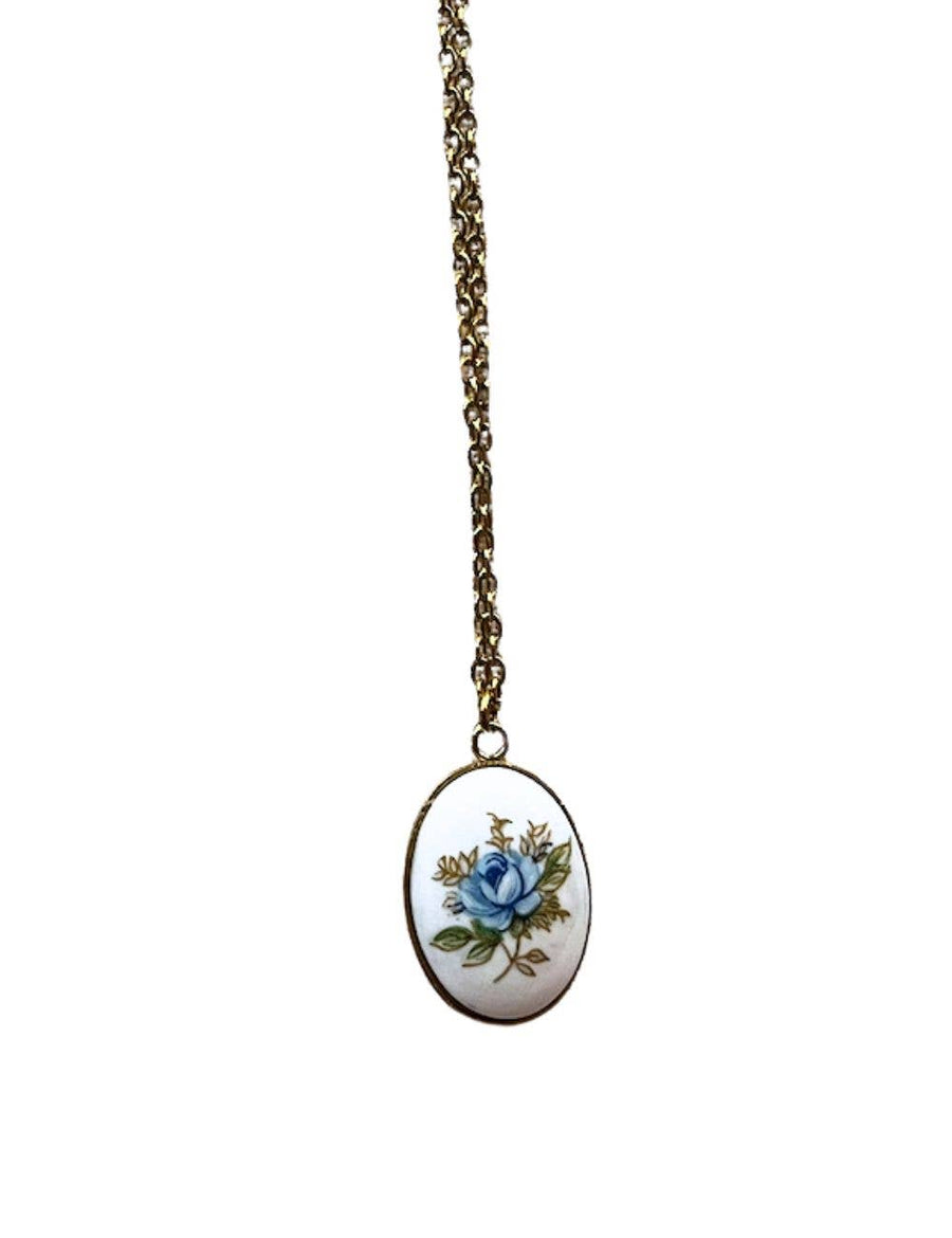 This necklace features a thin chain adorned with a vintage resin pendant representing blue roses. Total length 45cm - Pendant 2cm
