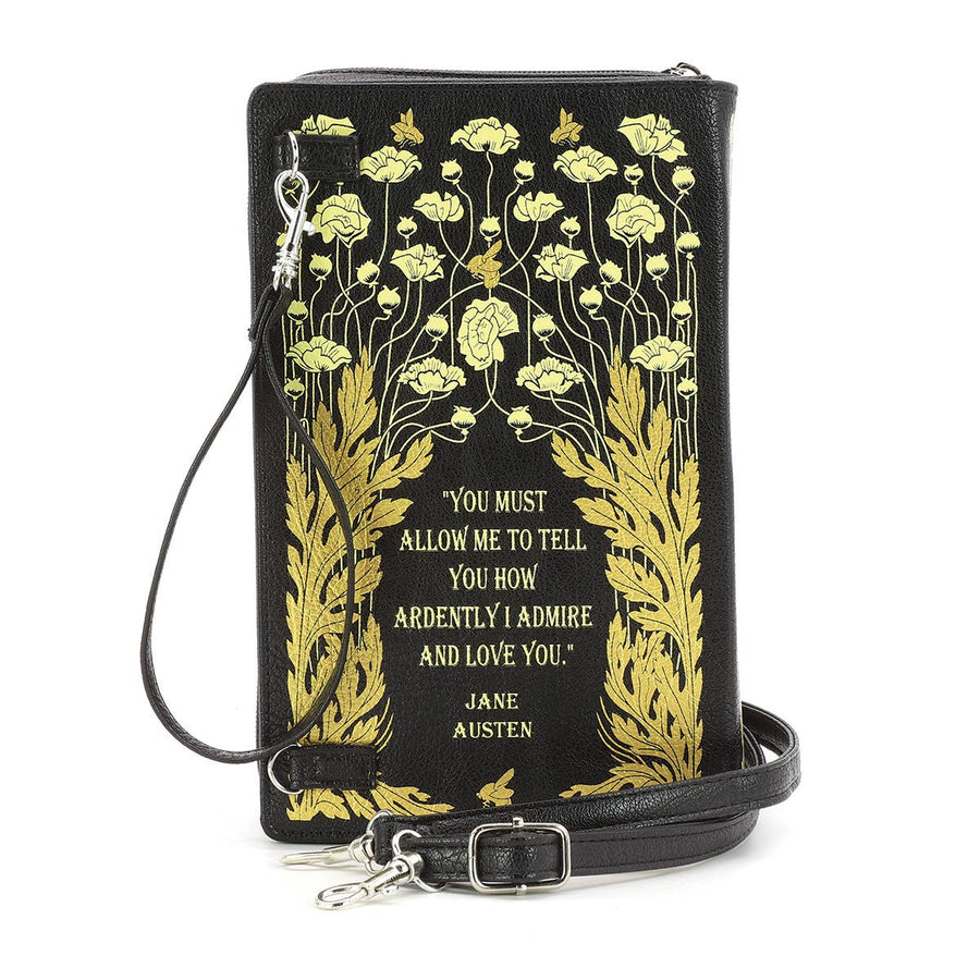 Pride and Prejudice Floral Book Clutch Bag Introducing the Pride and Prejudice Book Clutch Bag, a literary-inspired masterpiece that embodies the elegance and charm of Jane Austen's beloved novel. Crafted with meticulous attention to detail, this clutch replicates the iconic cover of Pride and Prejudice, featuring ornate Regency-era motifs and intricate floral designs.
