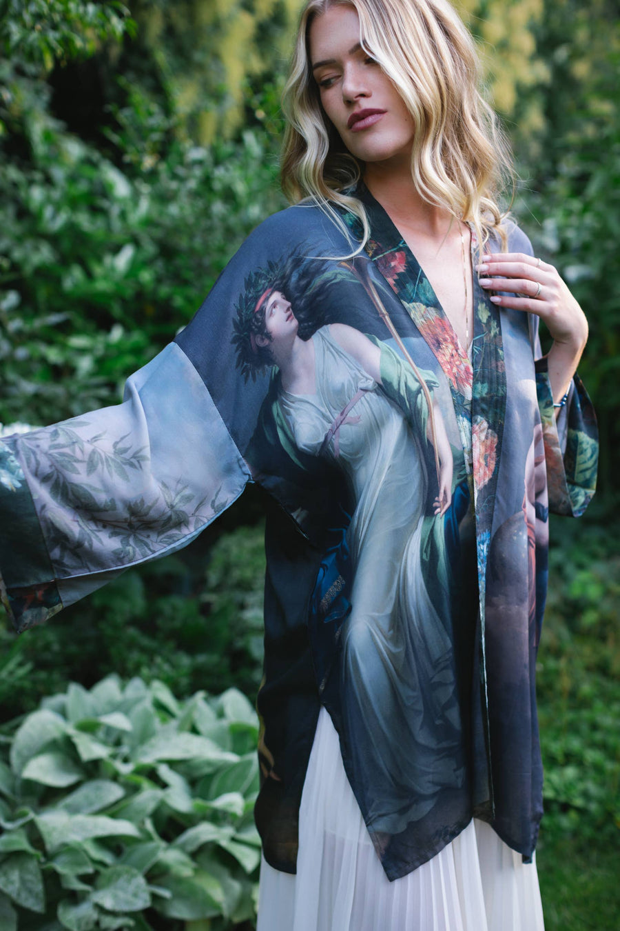 Introducing Reverie -- our ode to the magic of “the muse”, and to the sheer delight of inspiration! This dramatic, ethereal piece features paintings of three of the Greek Muses created in the 1700’s by French artist Charles Meynier printed on to our viscose fabric: Calliope (left front) — muse of poetry and music Urania (right front) — muse of astronomy and the stars Clio (back) — muse of memory 100% viscose (derived from plant fibres such as wood and bamboo).
