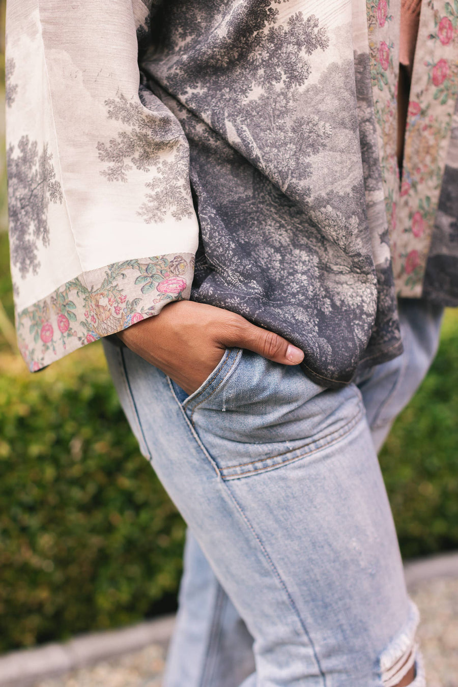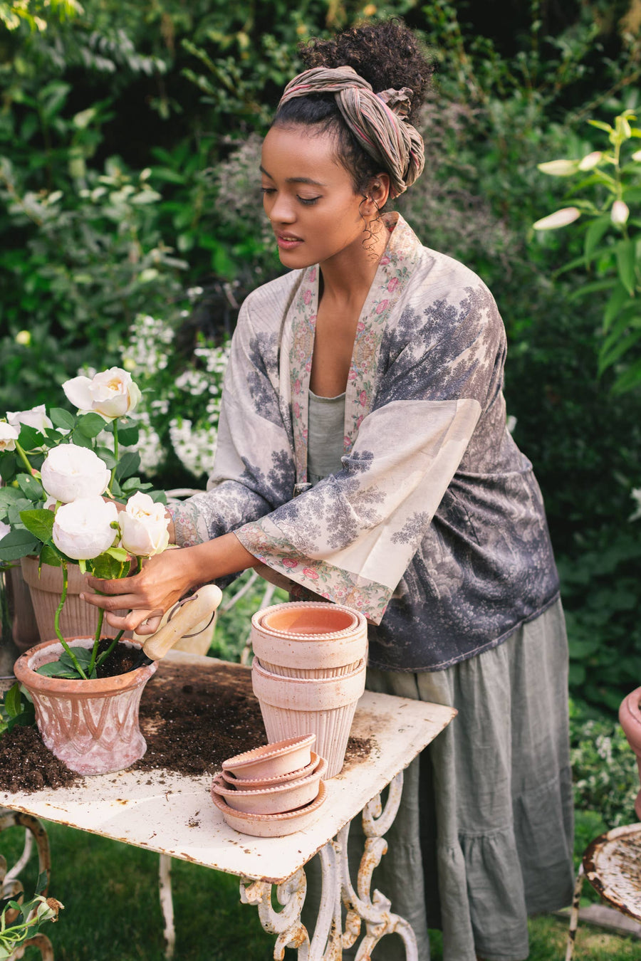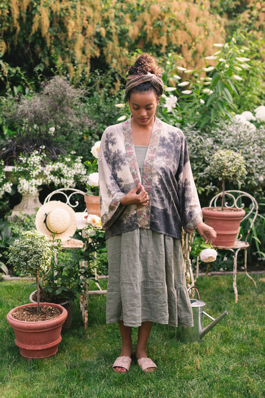 Dreamy, romantic, and full of hope — Still I Rise was created for those who meet each day with a loving and tenacious heart, come what may. We layered together several historic engravings from the 18th century to make this piece— including English forest landscapes by artist William Woolett— and married them with the captivating image of a woman boldly greeting the sun.