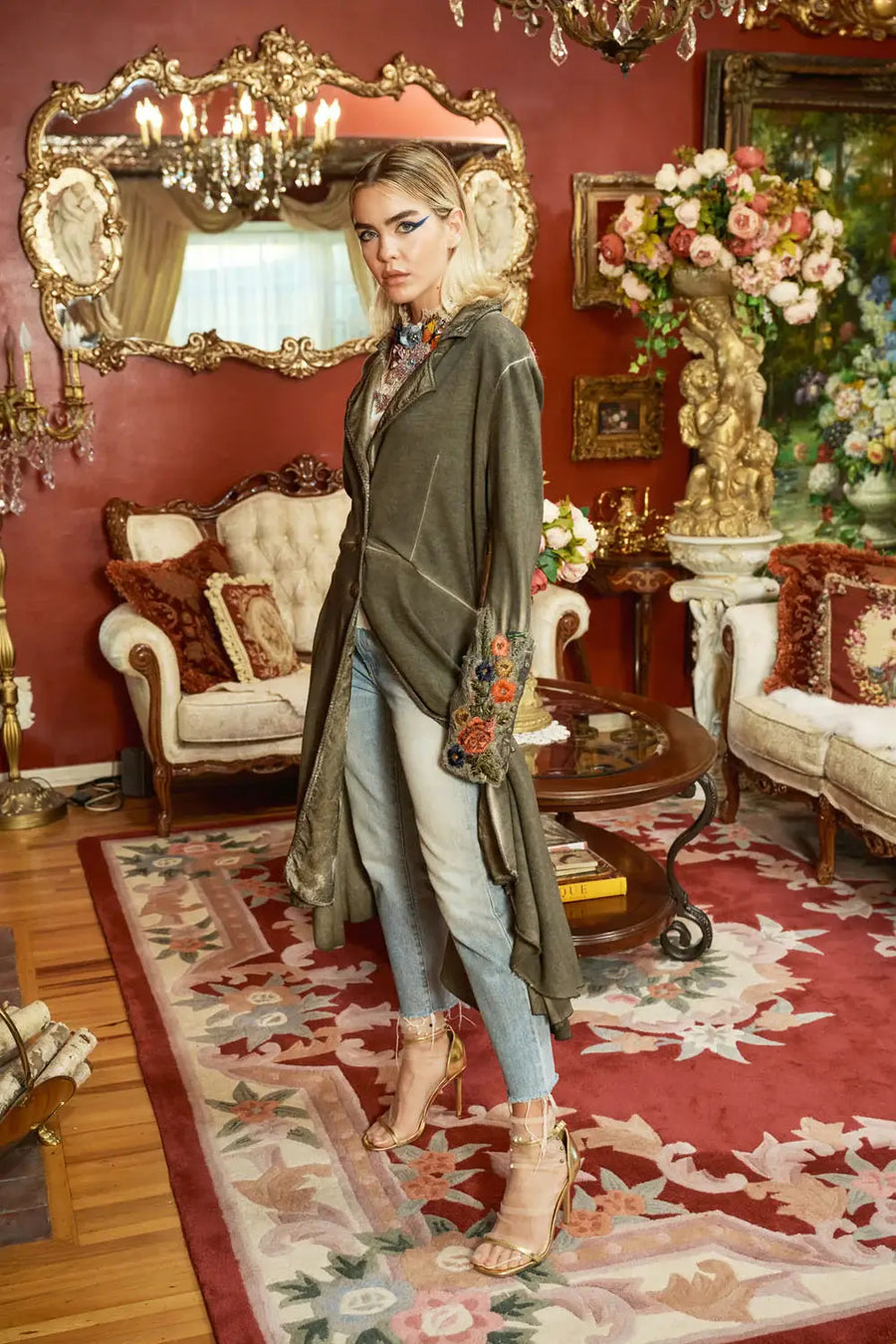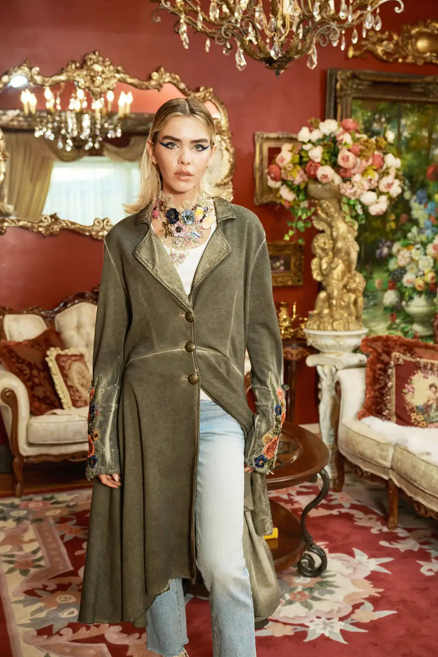 Washed French terry button-down asymmetrical hem coat, velvet collar/lapel, floral jacquard upper back, embellished floral trim sweater knit cuffs, 2 side pockets. Vintage ash