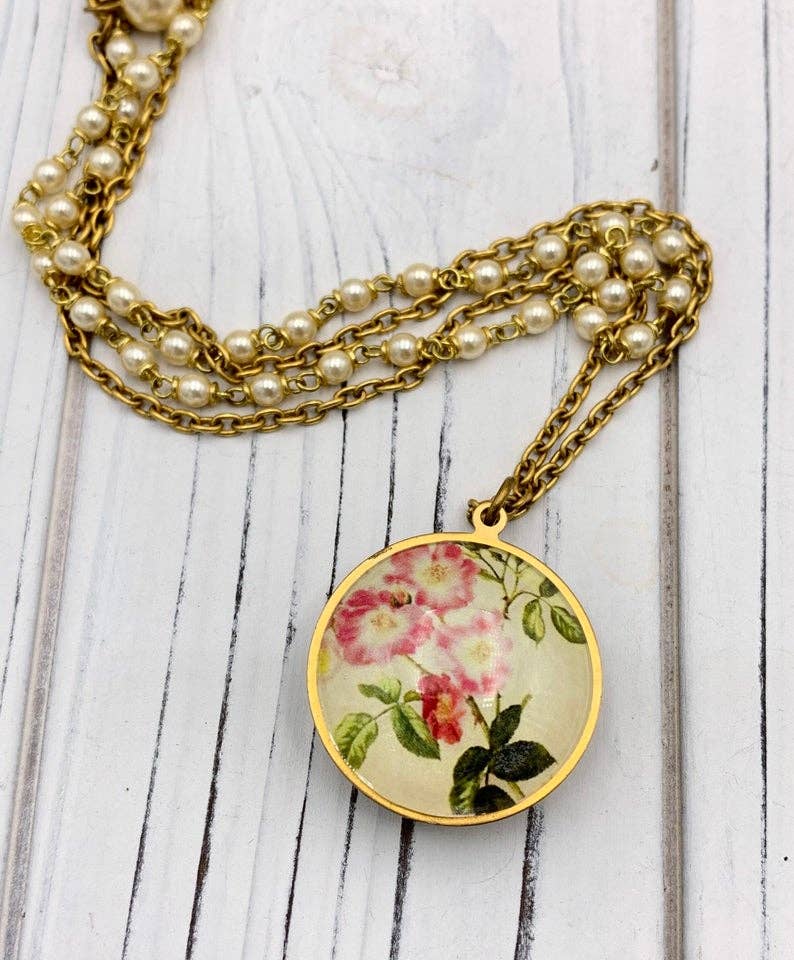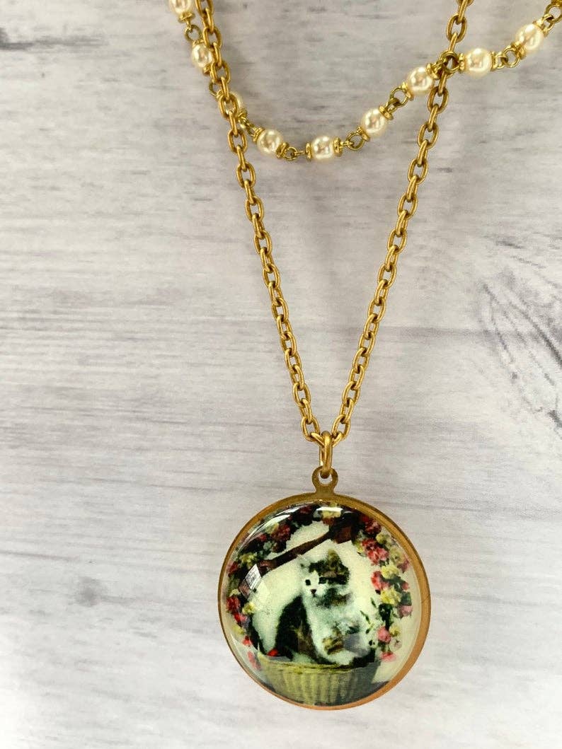 Double sided lens on brass pendant decoupaged with vintage prints, Mildred kitten on one side and blush flowers on the other. 25 1/5 " with 15" drop to the bottom of the pendant.