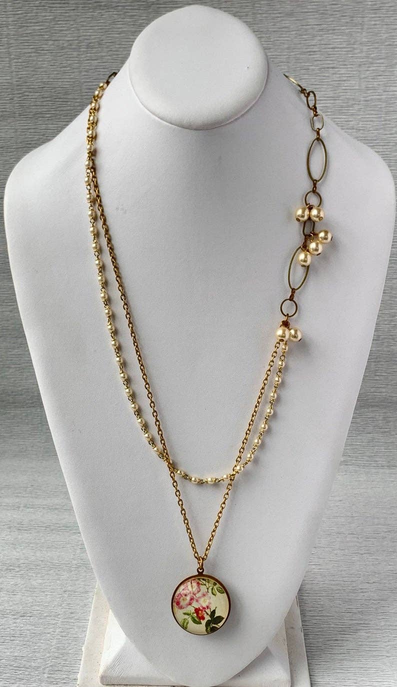 Simply charming double layered mix of gold plated brass chains and pearl chain pendant necklace.