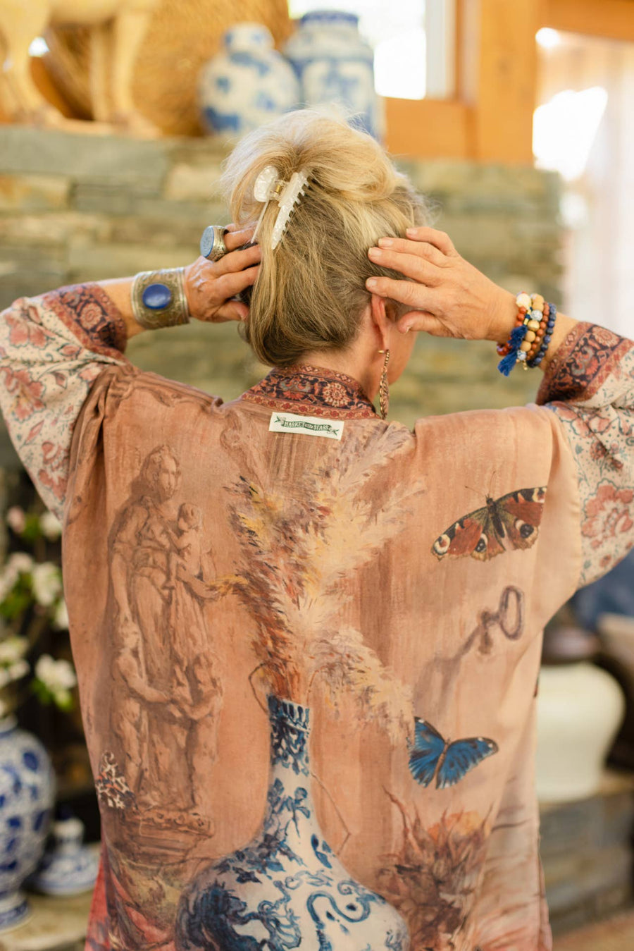 Machine wash gentle or handwash and hang to dry. Kimono meaurements: length 78cm, width (across back, underarm to underarm) 74cm. Diana our radiant blonde is 5'3 & Danielle our beautiful brunette is 5'2 for reference.