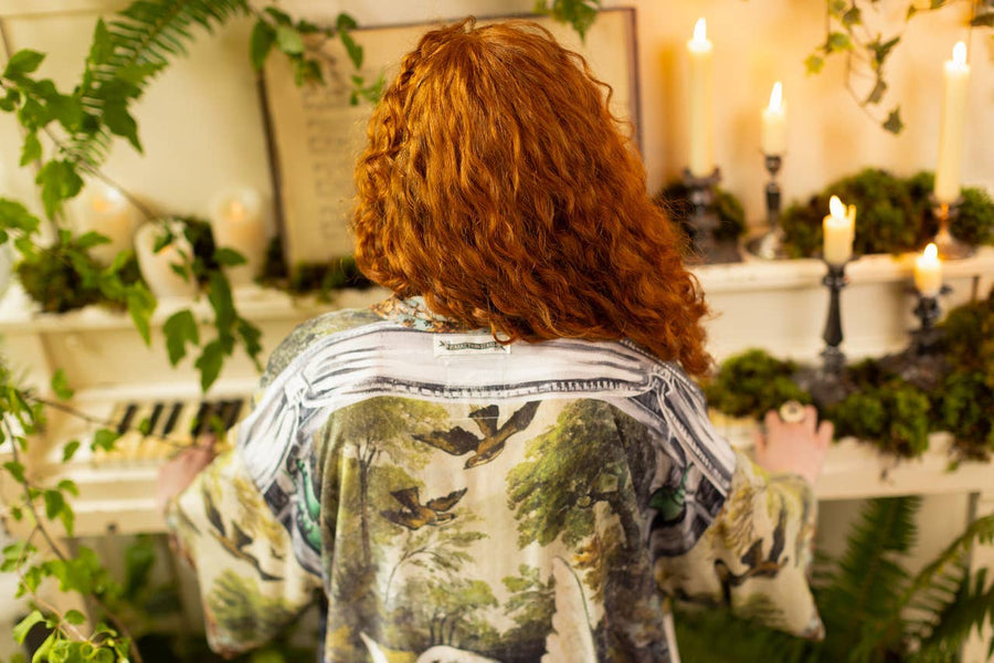 Inspired by a love of antique textiles, classic motifs and the seasonal beauty of the natural world, her work has a romantic and timeworn feel that’s easy to get lost in. Her paintings marry perfectly with our purpose here at Market of Stars: to create poetry you can wear. 100% viscose (derived from plant fibres such as wood and bamboo).