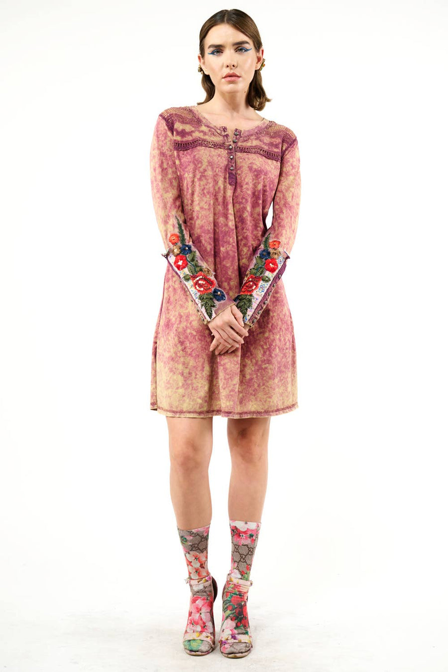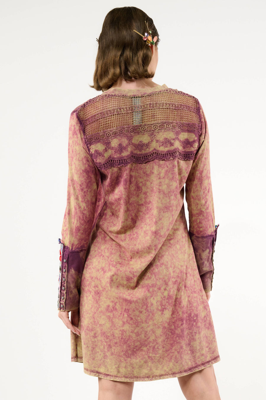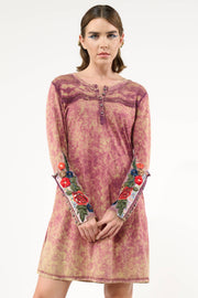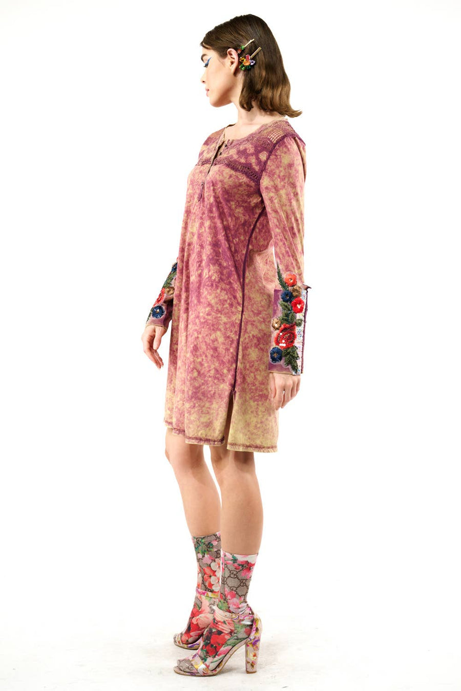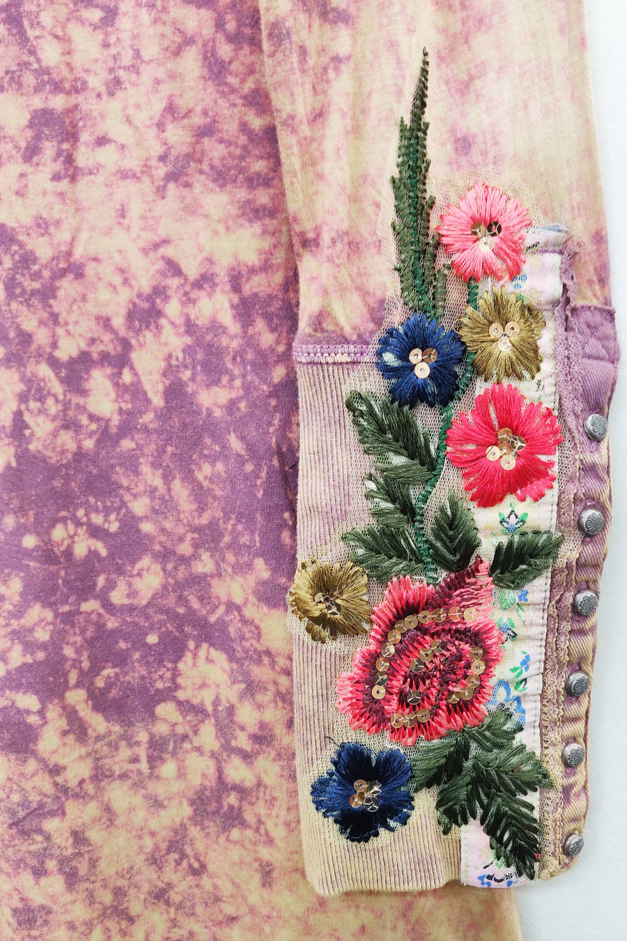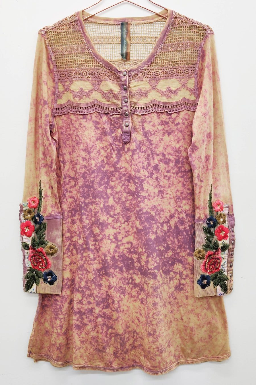 Washed tunic with embroidered mesh front & back yokes, sequin embroidered floral trims on cuffs