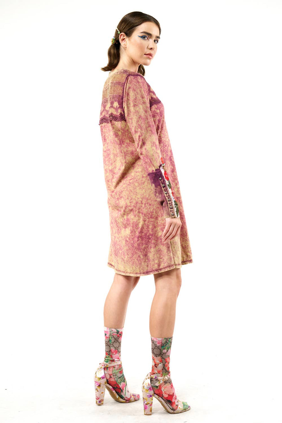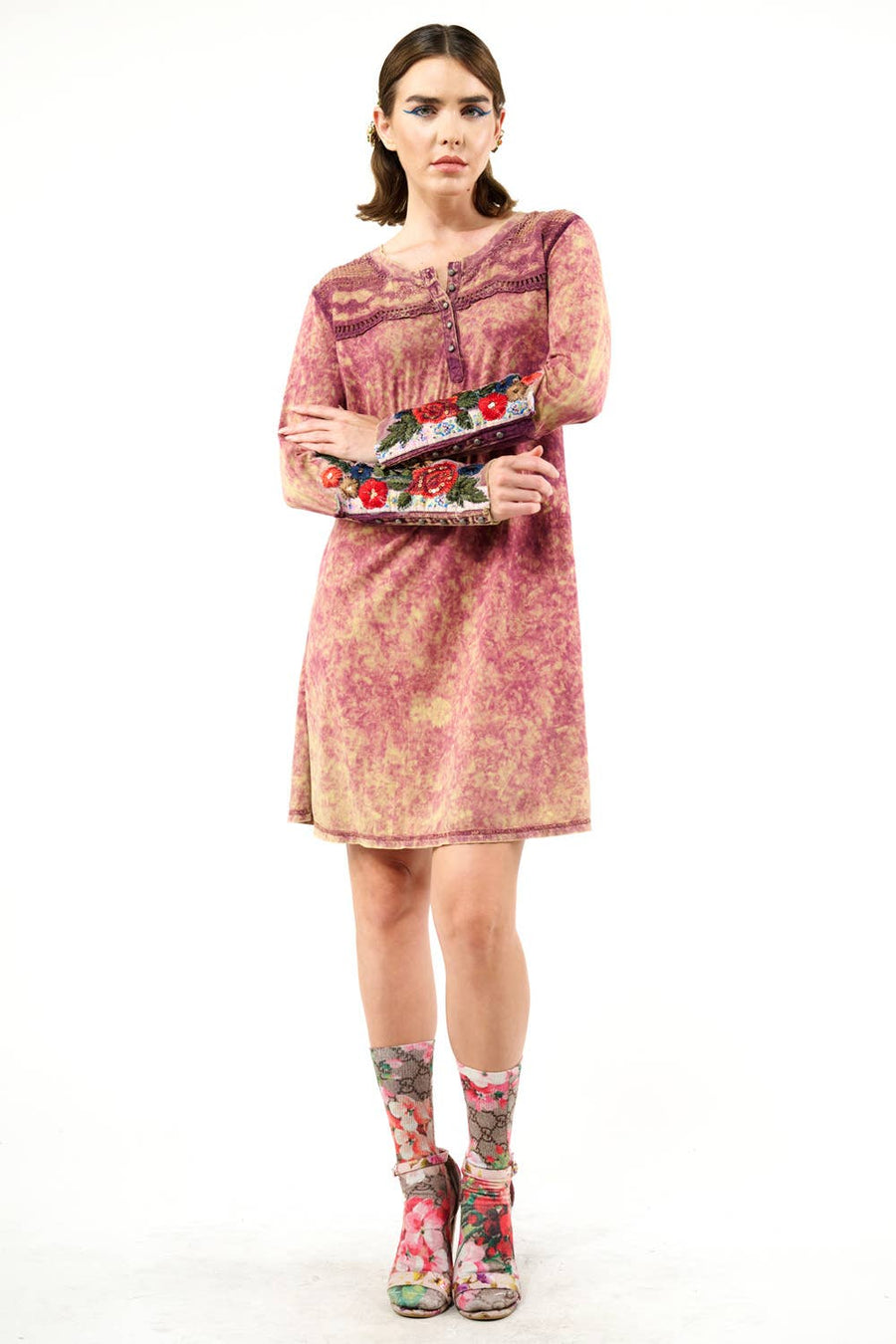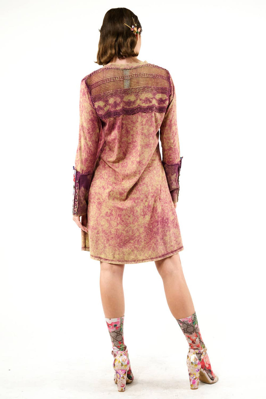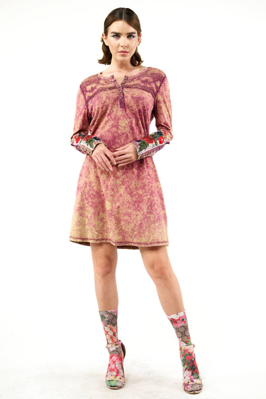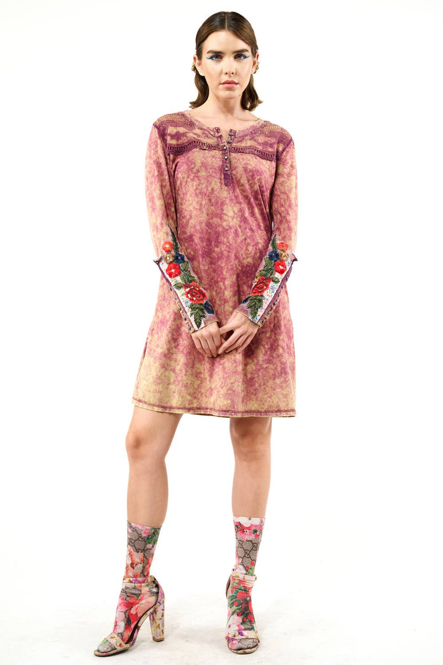 Washed tunic with embroidered mesh front & back yokes, sequin embroidered floral trims on cuffs