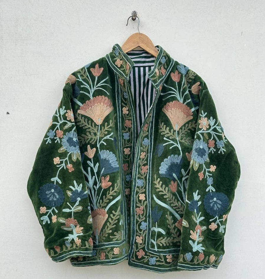 This jacket is made with velvet fabric and then the suzani is hand embroidered which is the specialty of this piece. This jacket is not reversible.
