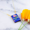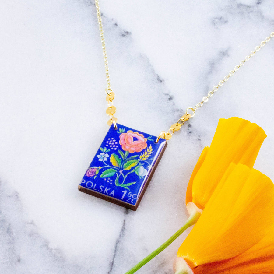 Add a touch of vintage charm to your jewelry collection with our Vintage Polish Stamp Necklace. Its intricate floral design is rendered in bright pastels against the brightest blue, making it a valuable addition to your daily outfit. Handmade with sustainably sourced North American hardwood, and finished with soy-based, BPA/VOC free resin to create a long-lasting piece that’s crafted to last.