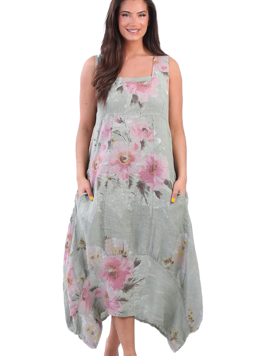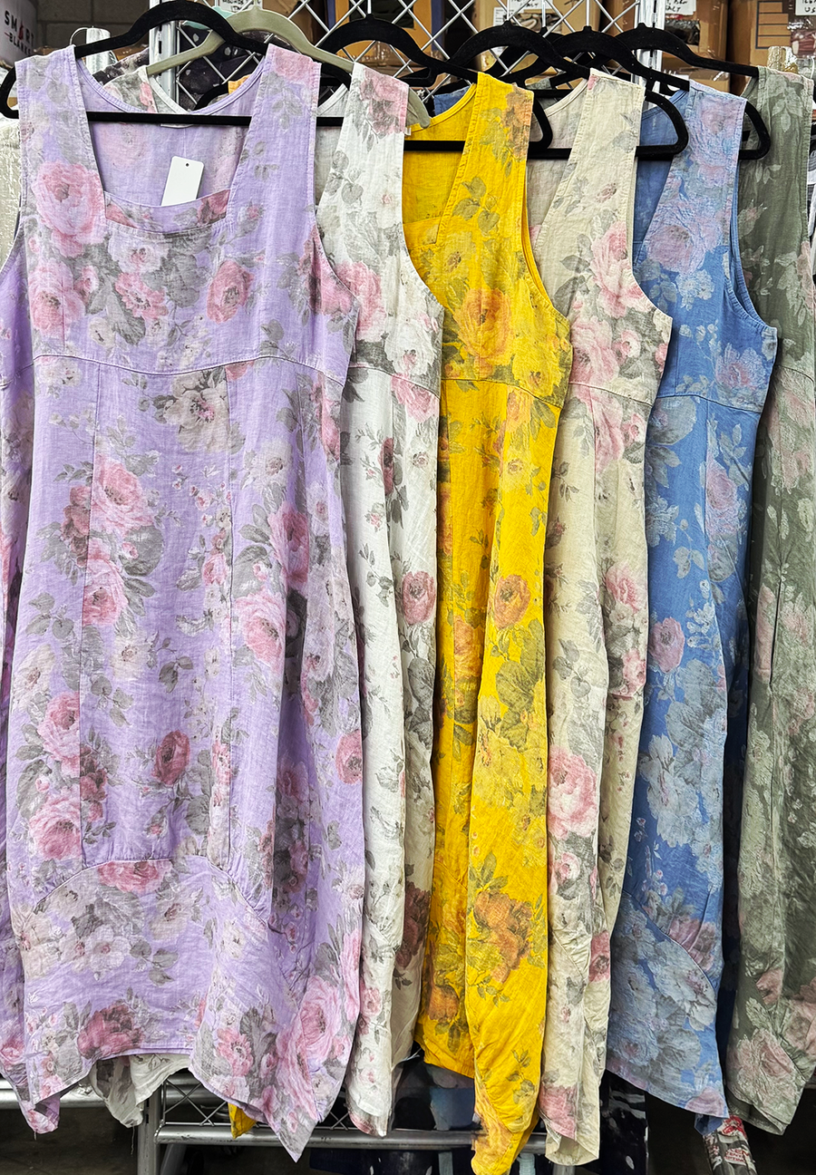 Key Features: Colors: Lavender, White, Yellow, Light Sage, Summer Blue, Olive. One Size Fits Most: Designed to flatter a variety of body types with a relaxed, easy fit. Sleeveless. Material: 100% Linen. Side pockets. Made in Italy.
